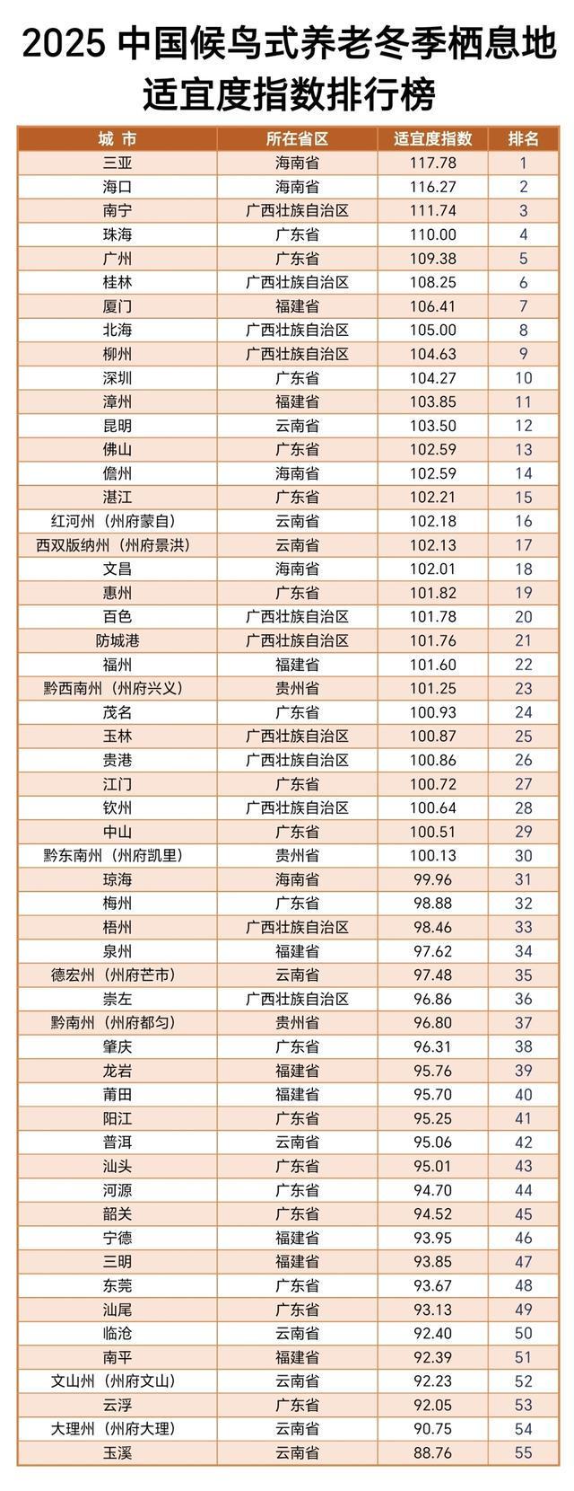 本周,中国就要迎来大雪节气了,你家在岁末年初制定度假计划的时候,有没有把“雁南飞”这种情况考虑进去呢?12月1日,《2025中国候鸟式养老冬季栖息地适宜度指数》在上海交通大学发布了,它为日益流行的候鸟式养老提供了一份有着科学依据的栖息地选择手册。在十大城市里,全境都处于热带的海南省城市数量仅仅排在第三,而广西壮族自治区可以说是收获满满了。