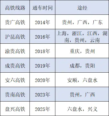 以上所提及的4条高铁干线成功通车,致使贵阳、安顺、六盘水、铜仁、毕节、黔南州、黔东南这7个市(州)踏入高铁时代,仅剩下的遵义、黔西南两地,分别经由渝贵铁路、盘兴高铁进行串联,达成高铁通达 。