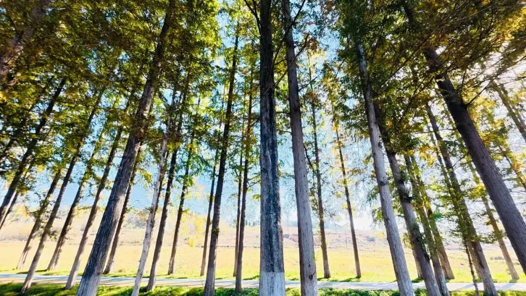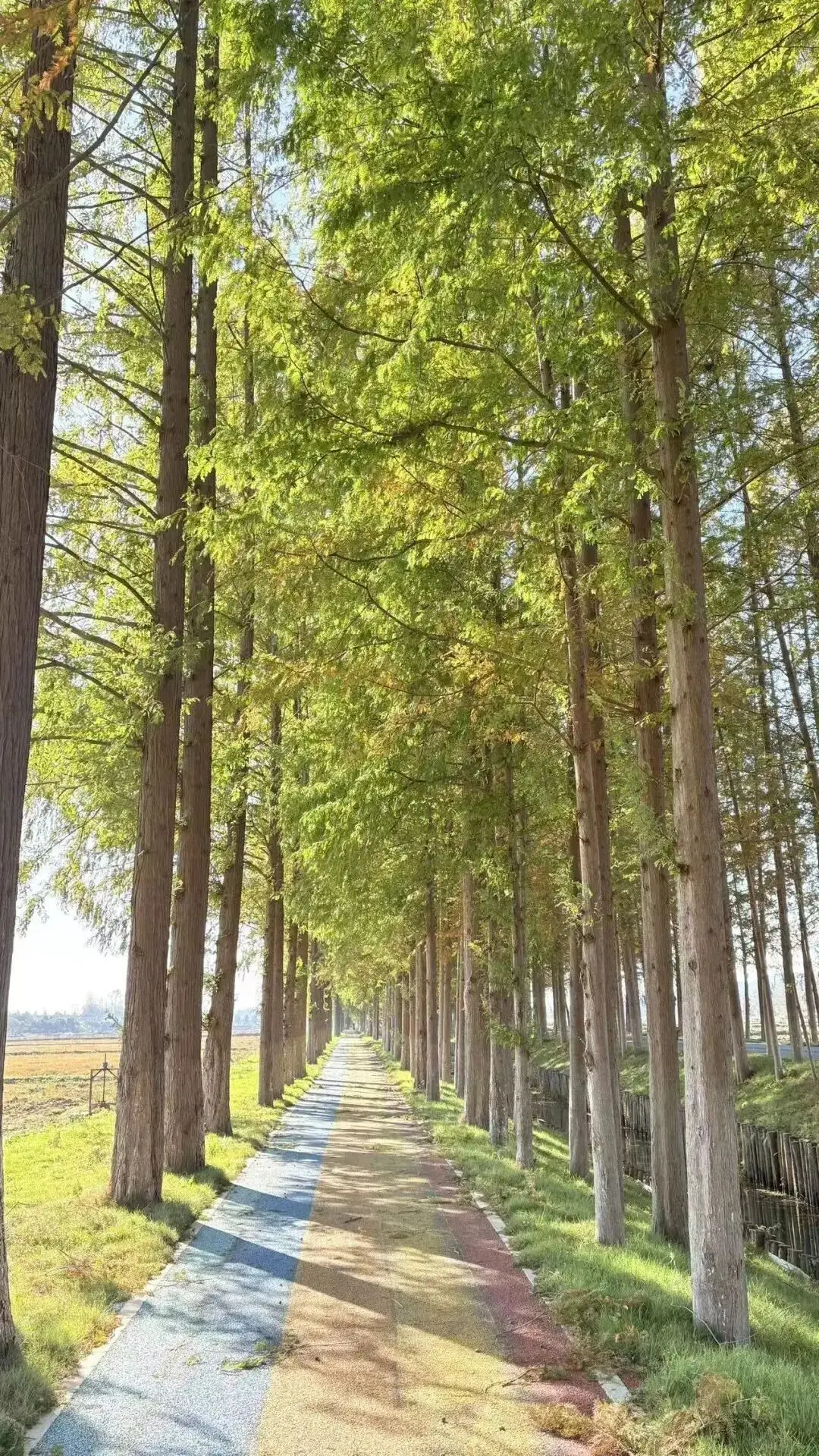 一踏入“十里长杉”的范围,有一排排水杉,它们在路边整齐地站立成排。这些水杉是在1990年寒冷的冬天栽种的,到如今已经扎根30多年了,树的年龄超过30年。它们长得笔直且高大,枝叶生长得很繁茂,在空中相互交叉连接,其中最高的差不多有5层楼那么高。