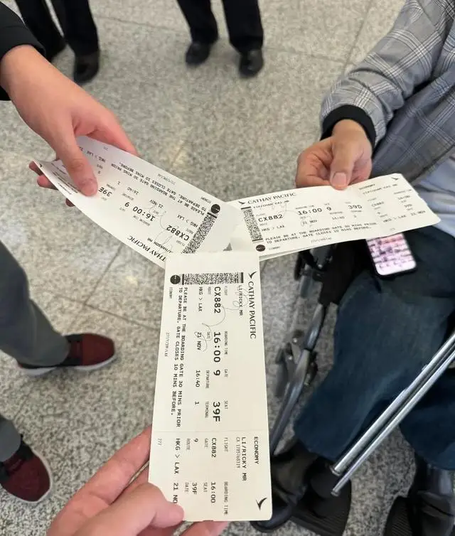 三个人按照顺序分别搭乘国泰航空以及卡塔尔航空,完成了一条从香港出发,途径洛杉矶、多哈、雅加达,最终又回到香港的紧密衔接的闭环航线,具体行程是,首先乘坐国泰航空从香港飞向洛杉矶,接着转乘卡塔尔航空抵达多哈,然后再前往雅加达,最终经雅加达乘坐国泰航空返回香港 。