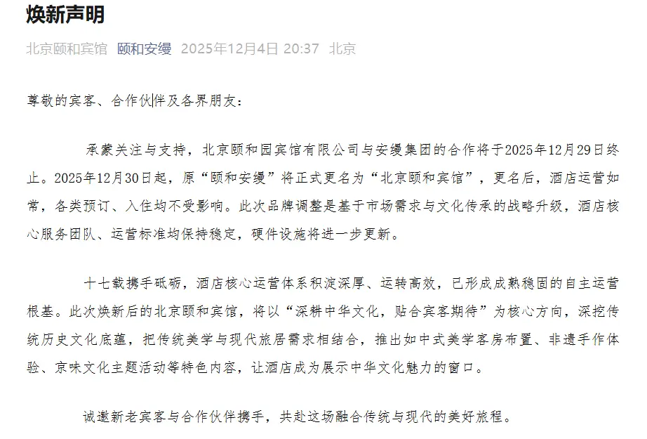 2025年12月29日,北京颐和园宾馆有限公司与安缦集团的合作会终止,这一消息由颐和安缦官方公众号近日发布。12月30日,北京颐和安缦酒店将会摘牌。从12月30日起,原来的“颐和安缦”会正式改名为“北京颐和宾馆”。改名之后,酒店运营仍旧如常,各类预订以及入住都不会受到影响。北京颐和园宾馆有限公司称了,这样的变动那是基于市场需求跟文化传承的战略再升级、再调整,核心服务团队和运营标准会维持稳定,硬件设施还要进一步的更新。从此,在2008年北京举办奥运活动那年开业,被认定为顶级奢华层次的酒店,在历经17年的时间推移之后,将会以全新的名称继续存在。
