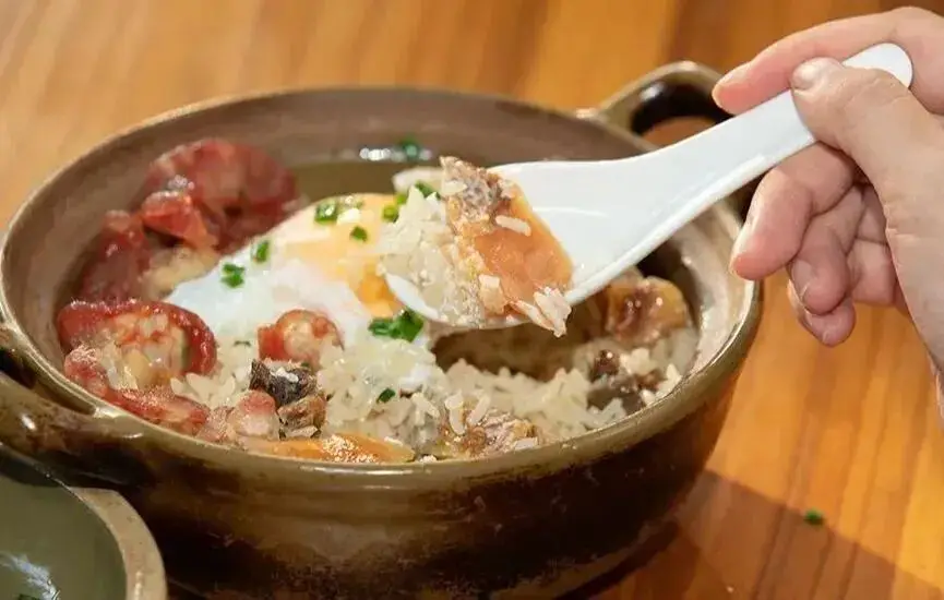 “马井红鱼香破釜”,深海红鱼被捕捞,随即被海风与日光凝练成深红色鱼干,这是大海给予的、方便保存的鲜美。它与腊肠、米饭在瓦煲中焗烤,鱼干醇厚咸香、腊味丰腴油脂与米饭甘甜充分融合。每一口,都能嚼出渔民与大海共生的辛劳、智慧以及收获的喜悦。