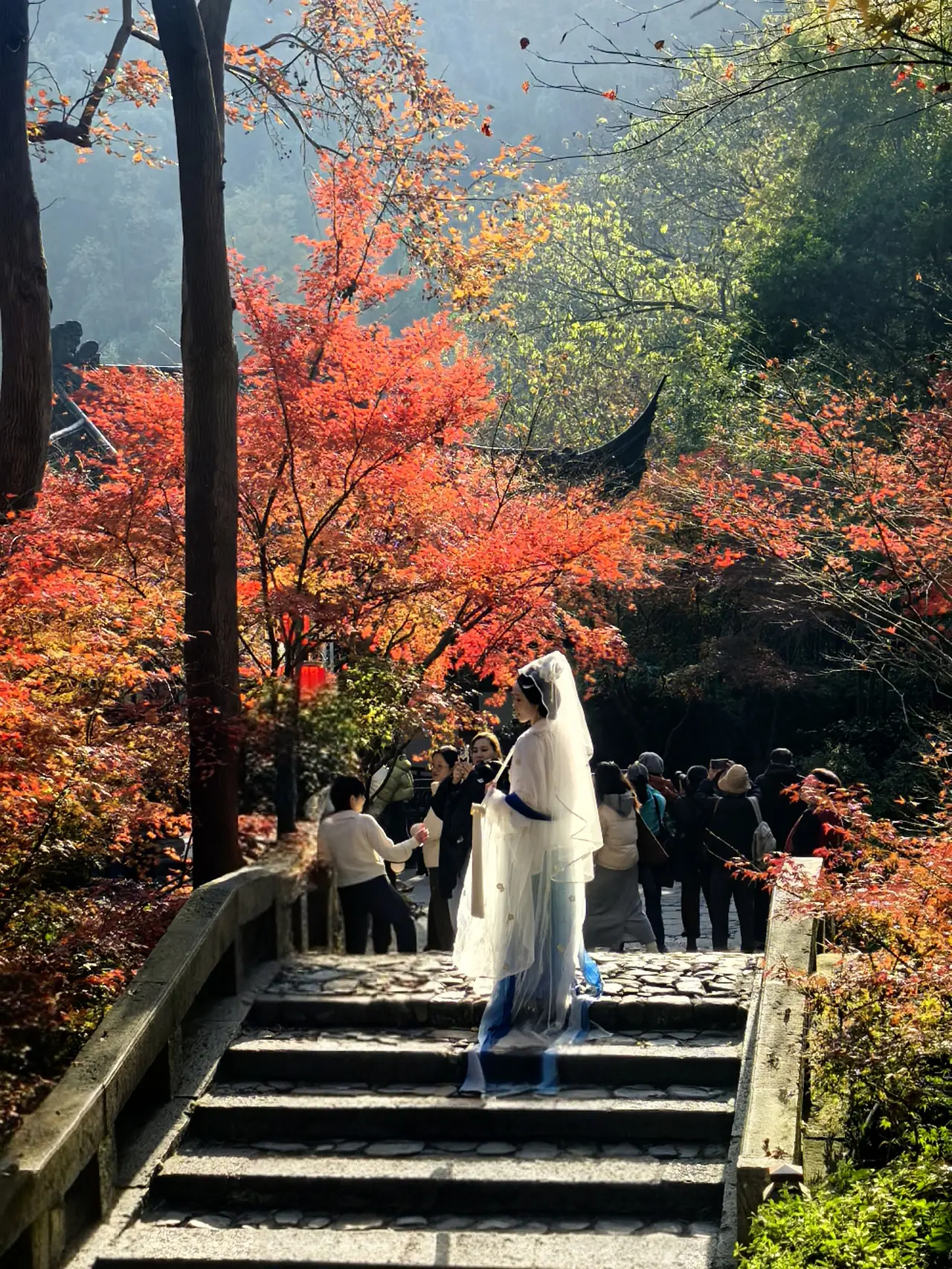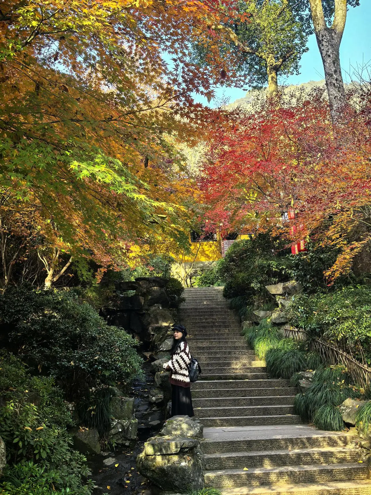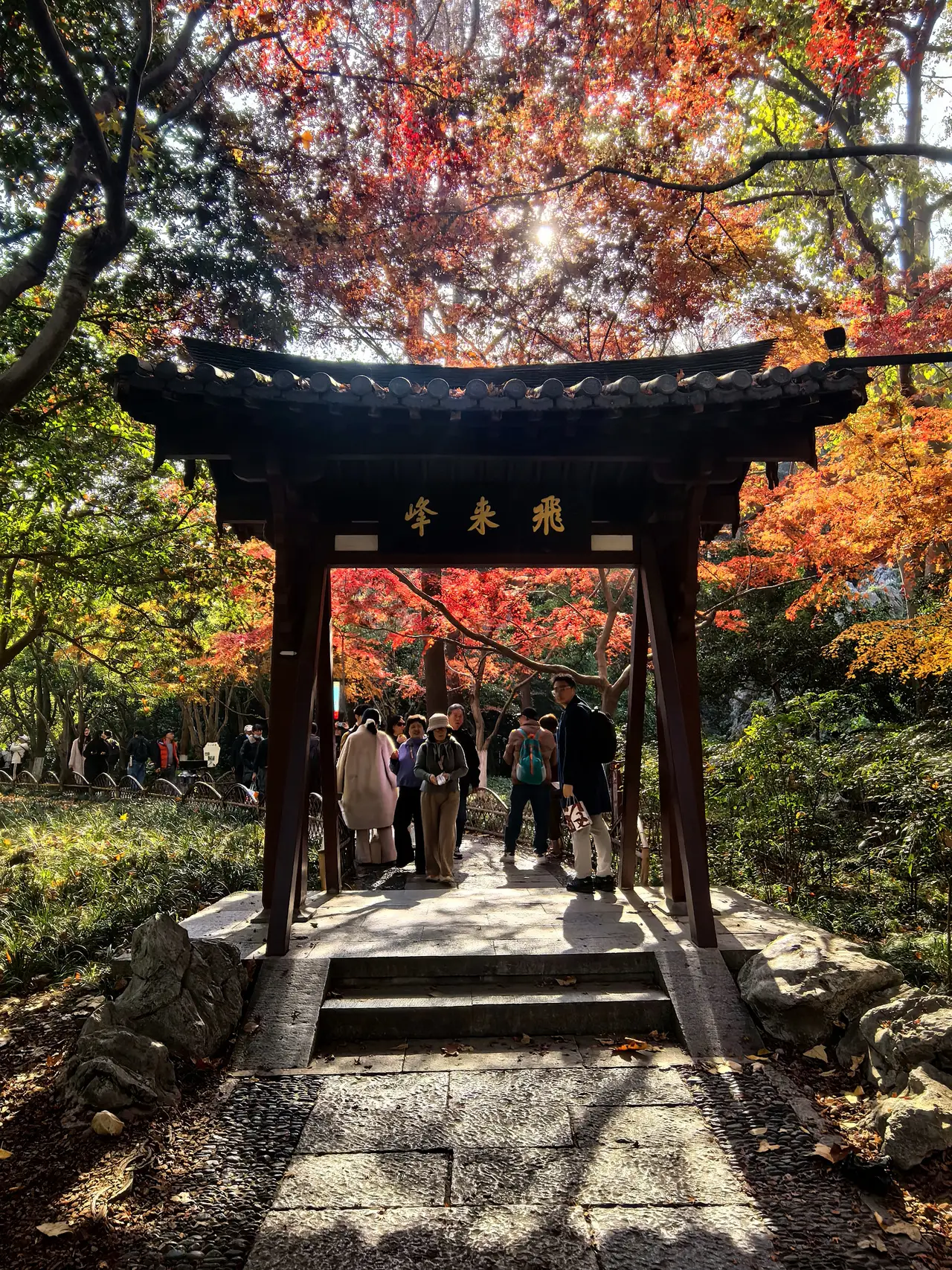 每当秋冬更迭,露愈发重,霜愈发浓之际,杭城那蕴含的大半诗意,都悄然隐匿进了山林之中,而飞来峰所呈现的枫景,却是这诸多诗意里头,浓烈艳丽到最值说道的一笔。于这片树木茂盛、幽僻深邃的秘境之内,灵隐、永福、韬光这三座寺庙,顺着山势而建,好似静静躺卧着,那古老佛像边的石刻,已然宁静伫立千年之久,山间溪水从石间流过,发出潺潺声响,一刻也不停歇,红枫的景致与禅意相互交融,古老韵味同秋日风光共同生长,每向前踏出一步去探寻,皆能偶然邂逅自然与人文相互交错而产生的惊艳之感,在我内心里,此地称得上是杭城山林以供赏枫的最为极致之境地。