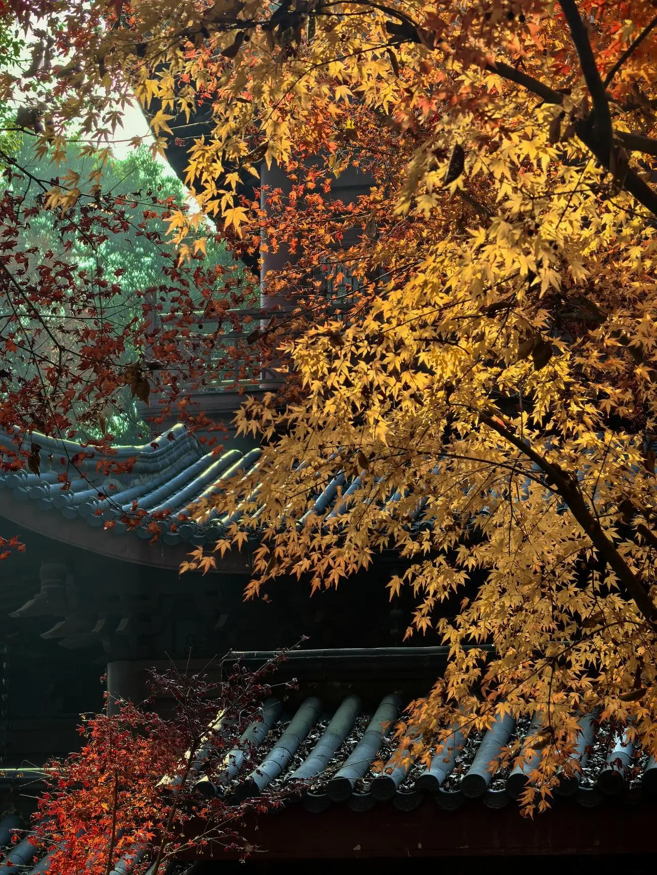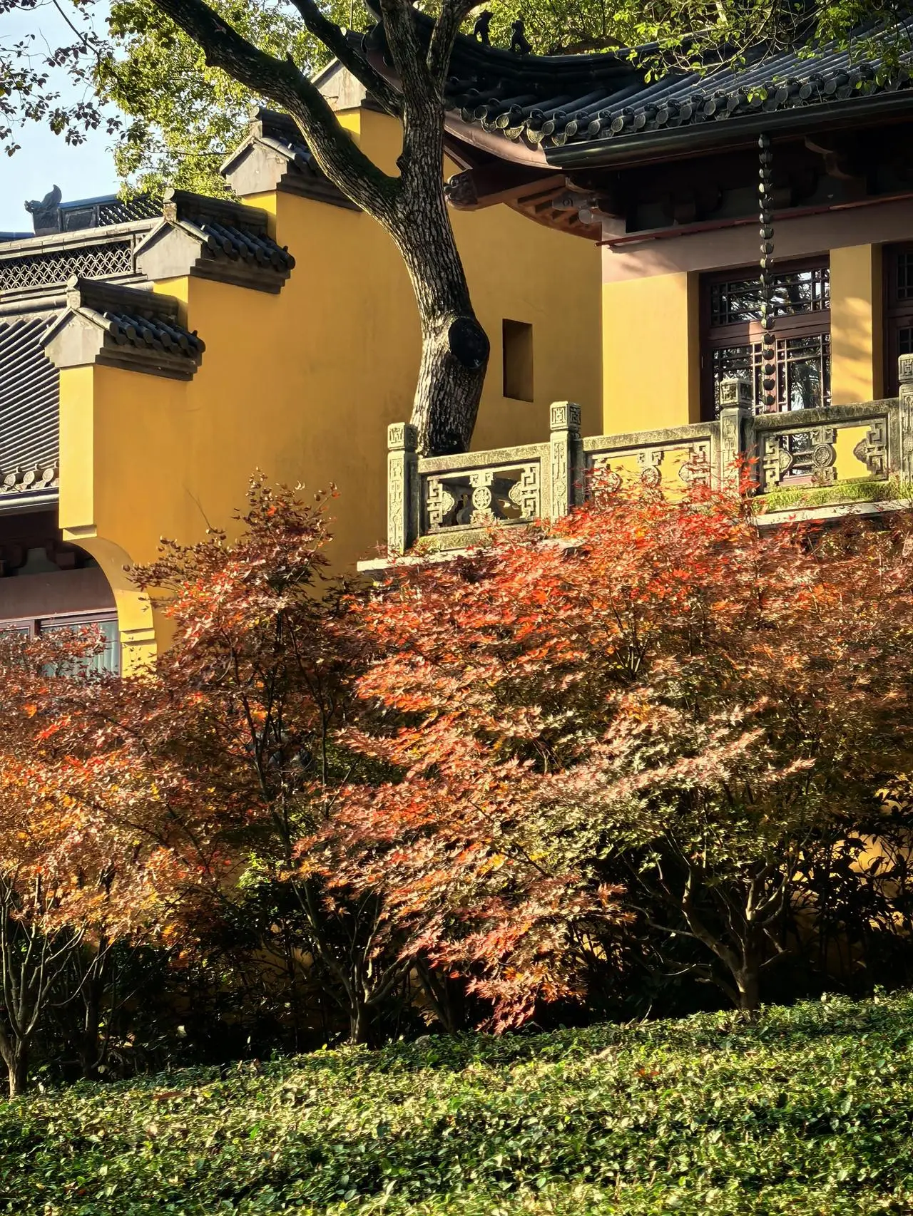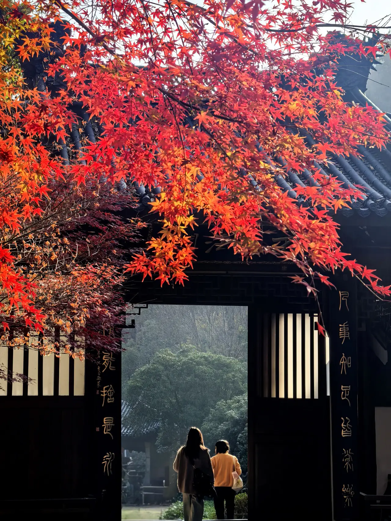 枫于灵隐寺,与佛音相伴,寺院里,香火缭绕,晨钟暮鼓未曾断绝,红枫藏匿于高处丛生的茂竹修林之间,虽说仅仅只有一两株作为点缀,然而红得那般纯粹,红得饱含着信仰。风轻拂枫枝,红叶发出飒飒声响,和婆娑竹影、诵经佛号相互交融,仿佛在讲述着千年的禅意,使人在枫情之中领悟到“一念清净,万般自在”的禅理。