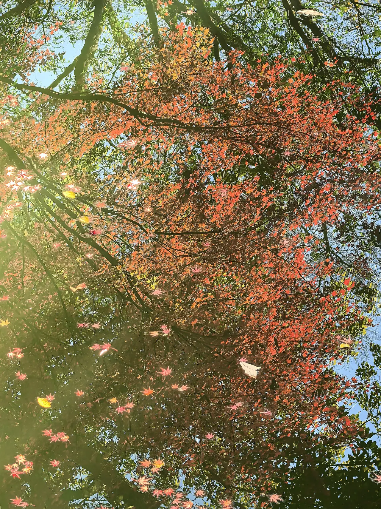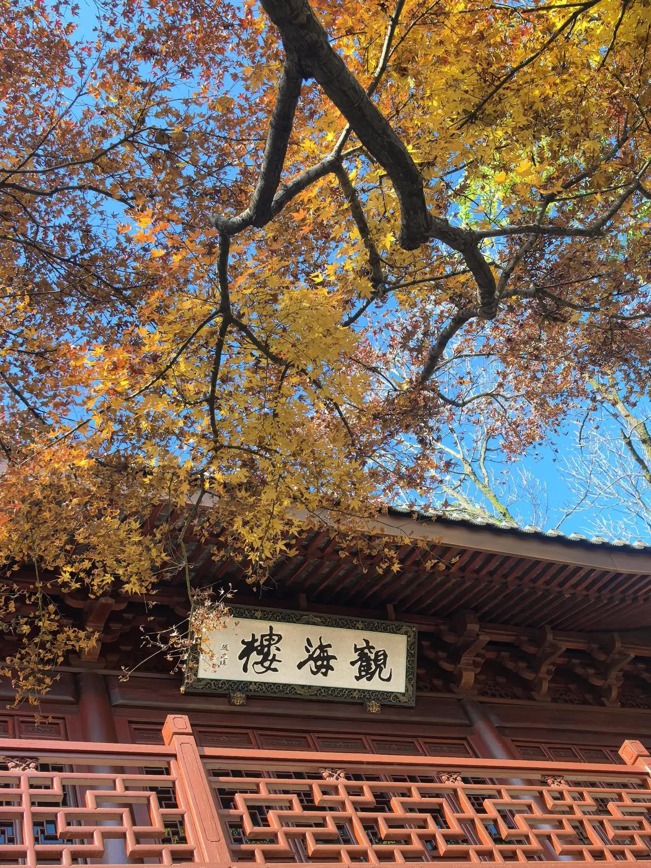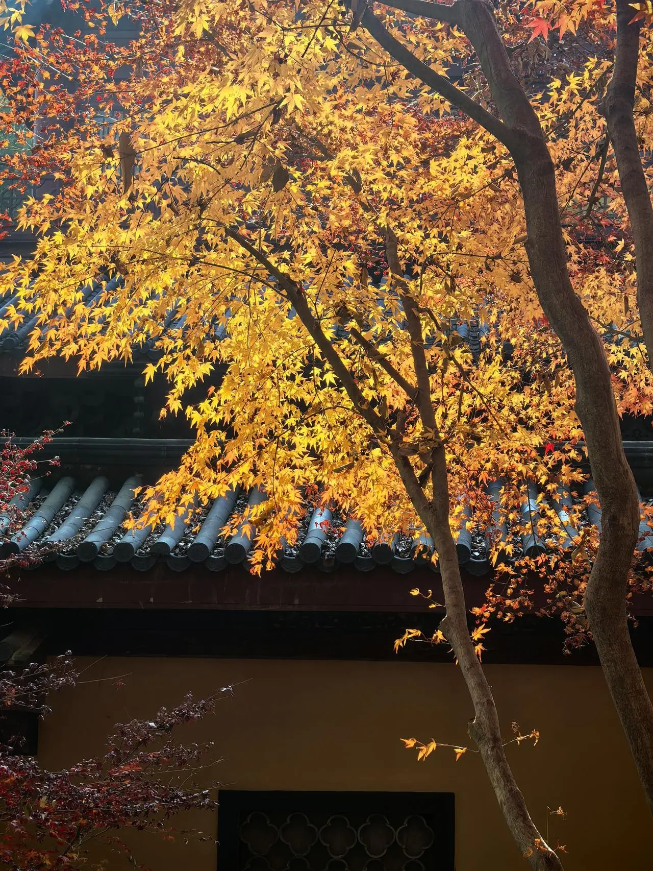 枫于灵隐寺,与佛音相伴,寺院里,香火缭绕,晨钟暮鼓未曾断绝,红枫藏匿于高处丛生的茂竹修林之间,虽说仅仅只有一两株作为点缀,然而红得那般纯粹,红得饱含着信仰。风轻拂枫枝,红叶发出飒飒声响,和婆娑竹影、诵经佛号相互交融,仿佛在讲述着千年的禅意,使人在枫情之中领悟到“一念清净,万般自在”的禅理。