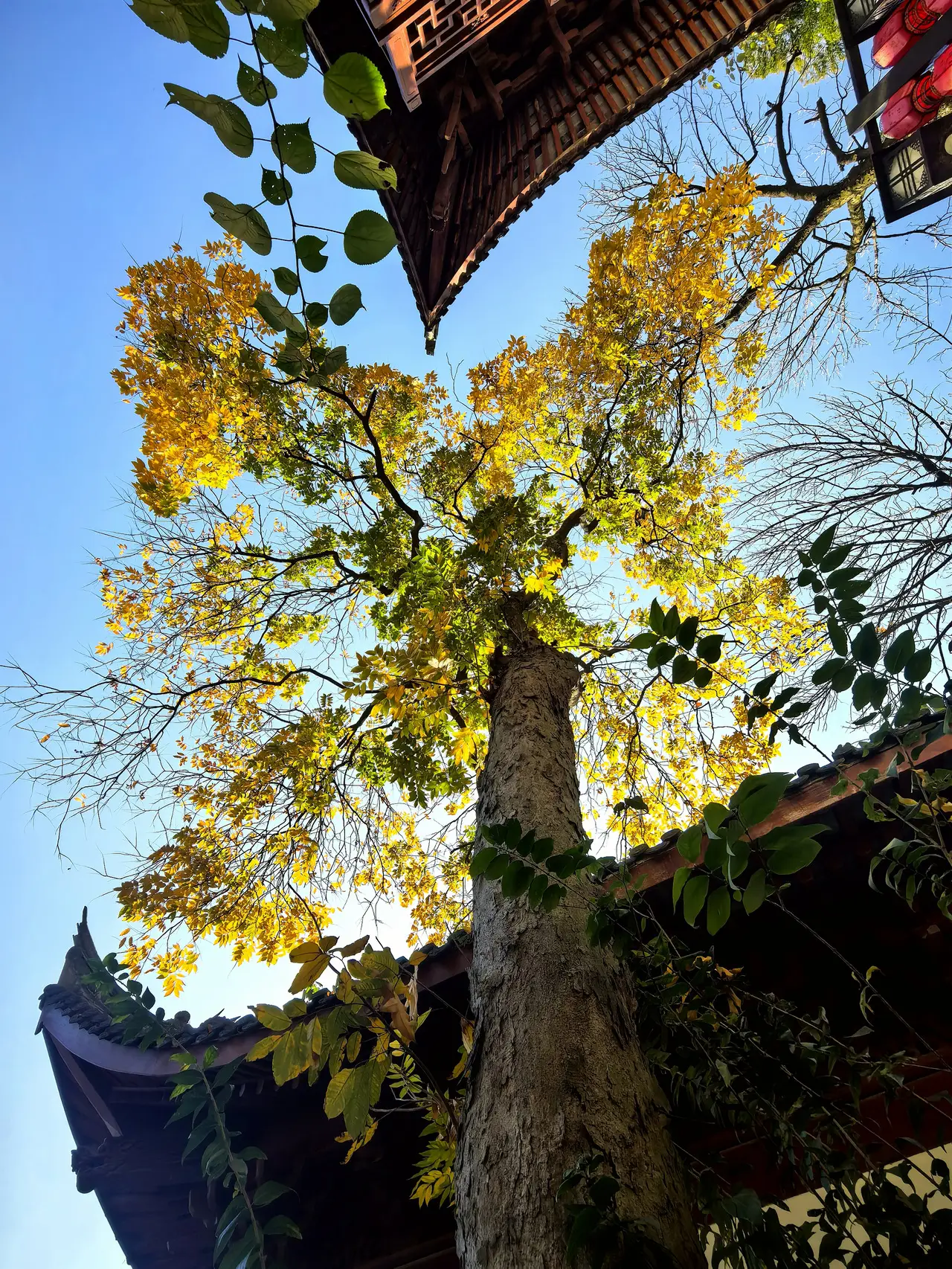 往福田阁去,是从“梵天香境”石坊启程的,在石阶转折的地方,老枫的枝桠倾斜着探向白墙,阳光穿过叶片,叶片的底部透亮得似琥珀一般,中段凝聚得仿若暖玉,梢头新红俏皮鲜明地超出暗红,一团团明黄并不比橙红逊色,就好像一把把热烈燃烧的火焰,把墙内的禅意映照得越发温润且通透光亮。