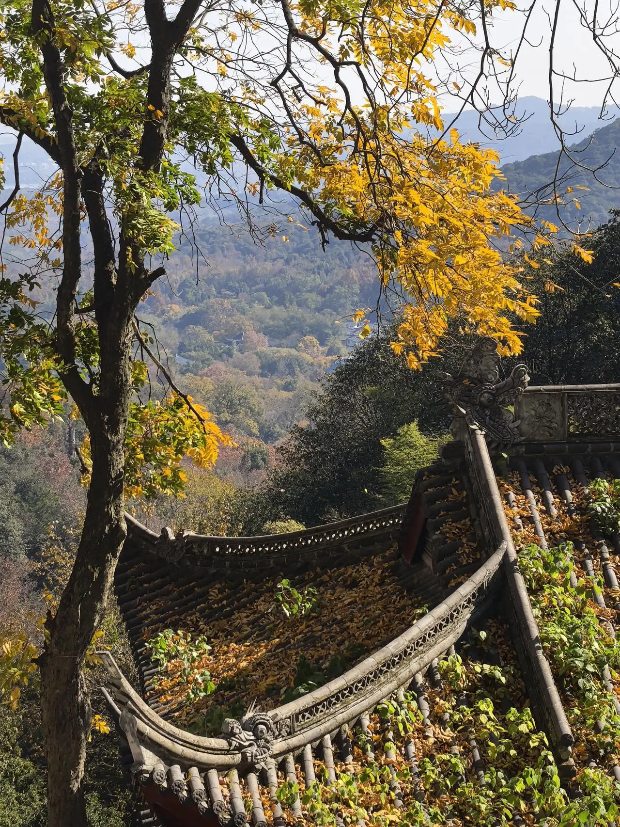 就在迦陵阁前的平台那里,朝着西边望去,呈现出的俨然是一组天然的三重画卷图景:一眼看过去,近处观音宝殿的深灰瓦当有着清晰的纹路,檐角那里呈现出翘立而宛如要飞起来的样子;稍微远一些的地方,枫梢如绯云一般涌动;再往更远处瞧去,北高峰的山脉呈现出苍郁且连续不断的形态。灰瓦、红枫、青山,这般层层递进起来,把山寺秋景的雅致完完全全地勾勒了出来。