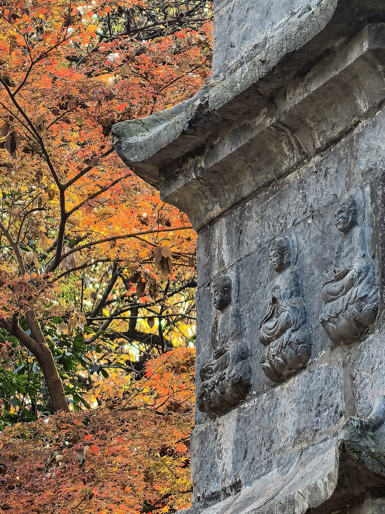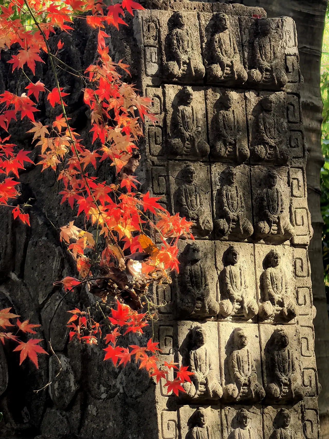 我近年心底偏爱的雅事,是在于石刻佛像的旁边去赏枫,除此之外,在杭城之地,就很难再寻觅到像这般美妙的境地了。在理公之塔的旁边,大多数游人的目光,都聚焦在了古老的塔上,很少有人会去留意塔旁边的红色枫叶,更加难以欣赏到二者同框时那种美妙的景色,我在心中不免就为红枫感到委屈。这就好像是相声里的主配角一样,主角虽然能够叫好叫座,然而却也不应该忽视了“捧哏”红枫所具有的那种点缀的奇妙之处。