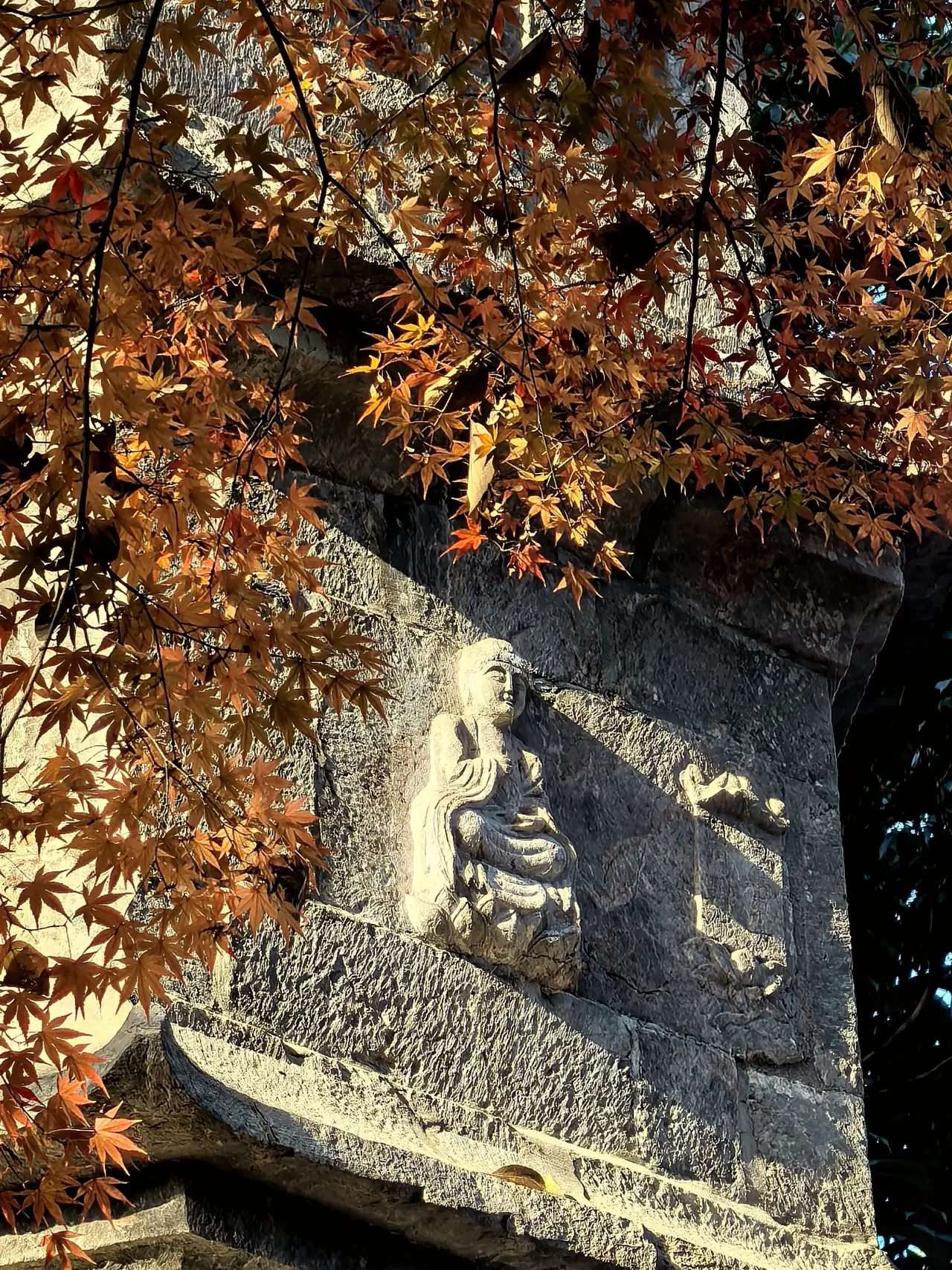 散布于崖壁的飞来峰摩崖造像,历经五代至宋元数朝雕琢,姿态各异神情肃穆,每一尊皆承载古人信仰与匠心,然而造像群周边却很难找到红枫踪迹。我时常 ,如果在石刻旁边种植好几株枫树,并让它们扎根于崖壁缝隙,与石佛一起相伴千年,那将会是怎样的景致。在这里所看到的,仅仅是寻常山林的黄叶,落在石佛的肩头、脚边,似乎是在为古佛拂去岁月的尘埃 。