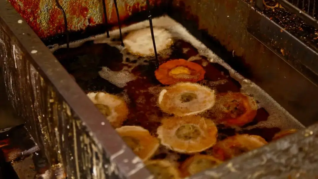 有铜勺饼,还有炸芋头丸子,或者芋头条,亦或是芋头片,同时有炸辣椒,咬下去的时候嗞地一响特别脆 ,那香气浓郁至极 ,能够买回去当作手信 。