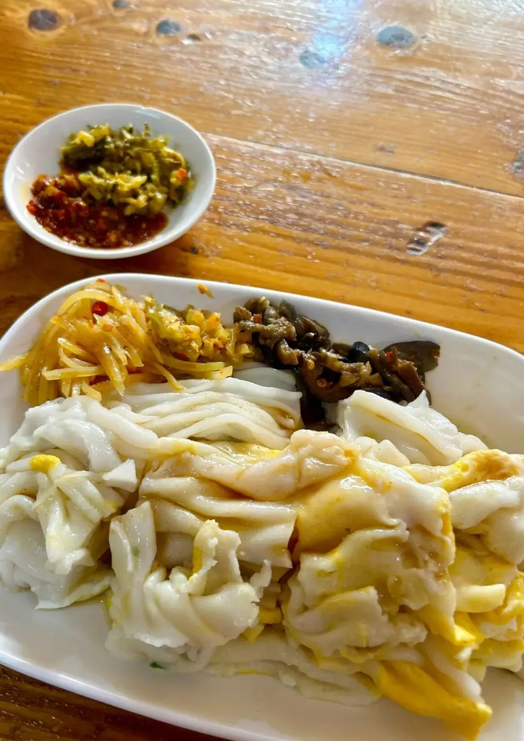 于刘记小吃店所食之肠粉,粉皮相对较厚然,可添加诸多品类小菜,其中包含酸菜以及茄子。