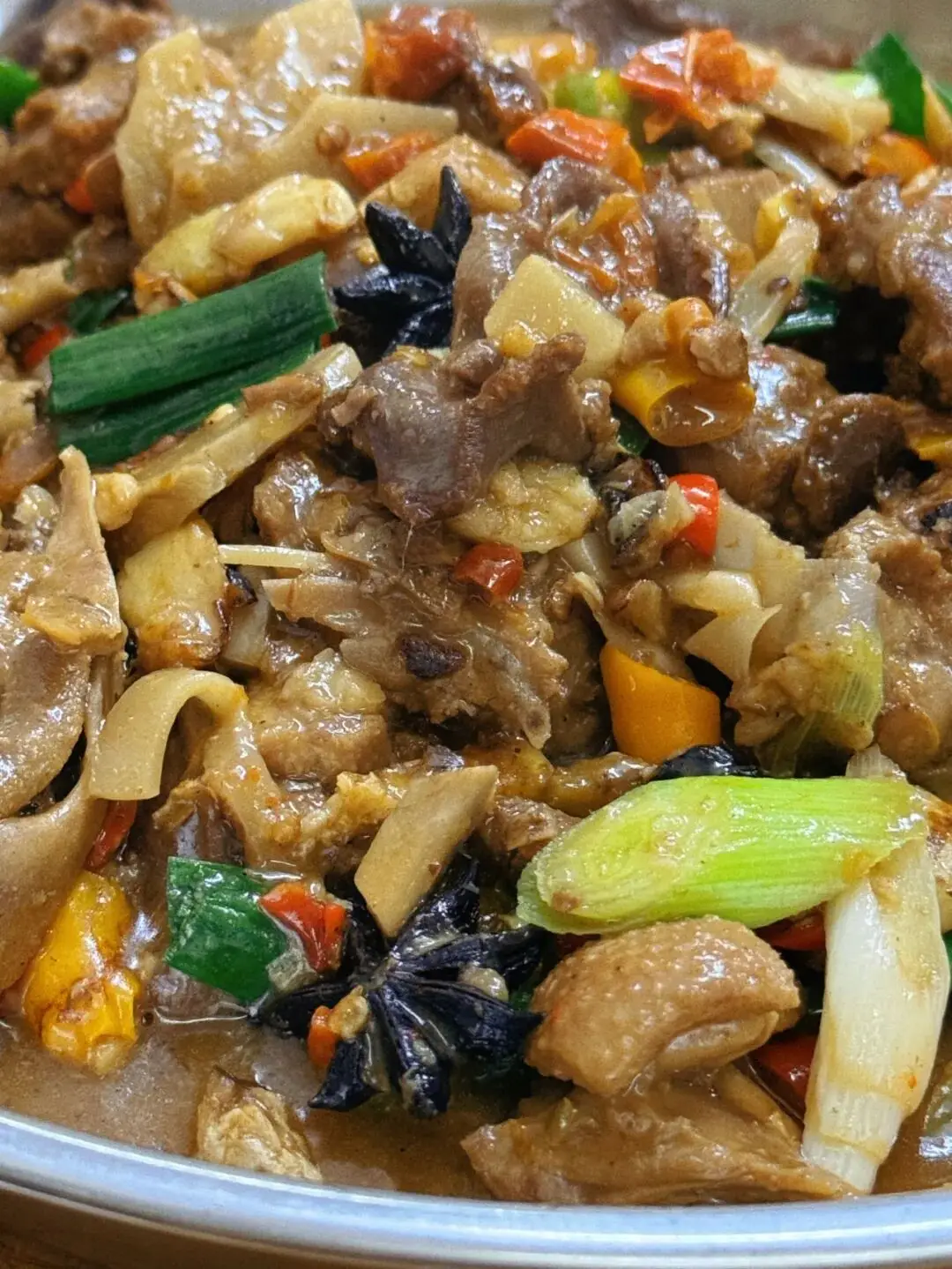 有几种辣椒出现在牛三宝里,然而都是那类没那么辣的鲜椒,牛肉给出一种口感,牛肚给出一种口感,百叶给出一种口感,这是一道极美妙的下饭菜。