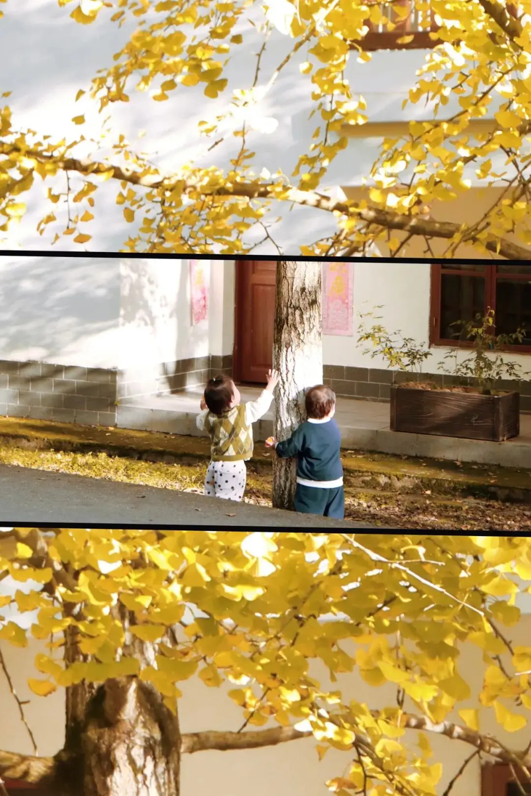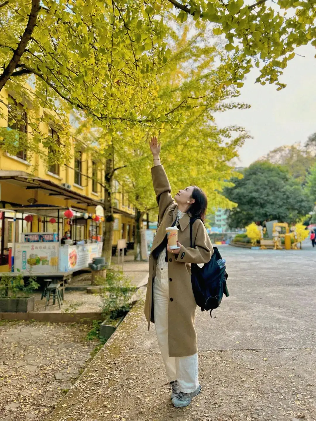 我们原来计划是留到末尾的,待到后面准备出去之际,天色已然变黑,因而失去了手捧着黄澄澄银杏叶的时机,最终只好踮起脚装作触碰一下 。