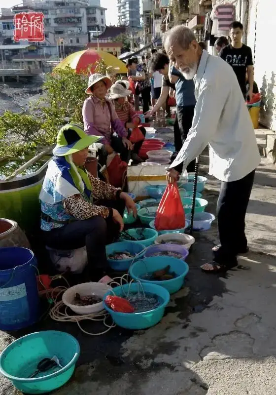 傍晚时分,工厂大门被打开,紧接着自行车的大潮,伴随着叮铃叮铃的声响,蜂拥向前冲了出去。有一些穿着传统棕色短衣裤戴着斗笠皮肤黝黑的渔民,直接在岸边把刚刚捞上来数量众多新鲜程度不一样的海产展示售卖出来 。