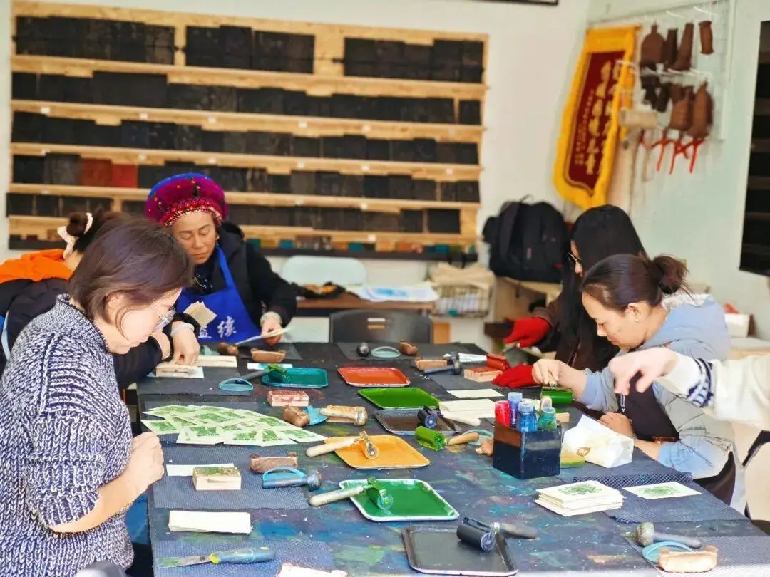 在12月2日,于匠志集大理民艺中心里面,游客们正在进行甲马版画制作的体验。湖南游客罗楠讲,她已经在喜洲旅居了一年,在这段时期,只要有空闲的时间,她就会来到匠志集去体验非遗项目。罗楠还说道,现在的甲马有了‘发财’‘被爱’等现代主题,其寓意是很不错的,像我们这些年轻人都是非常喜欢的。