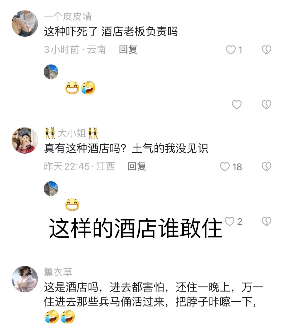 比如说,近期这位前往西安旅行的男子,遭遇了一件事,这件事让他觉得大开眼界,尽管酒店颇具特色,然而从内心来讲却喜欢不起来,甚至还产生了一些害怕的情绪,就这样心惊胆战地度过了一晚,独自躲在被窝里瑟瑟发抖,最后当事人宣称:一晚上都没敢睡觉,以后再也不想来了。