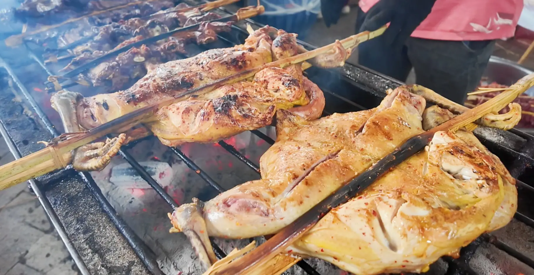 炭火发出噼噼啪啪吵人的声响,各式各样傣家特色的烧烤在铁制的架子上面使得油滋滋地向外冒出来,像香茅草烤鱼、烤鸡这样的经典型美味让人看到就不禁口水直流。