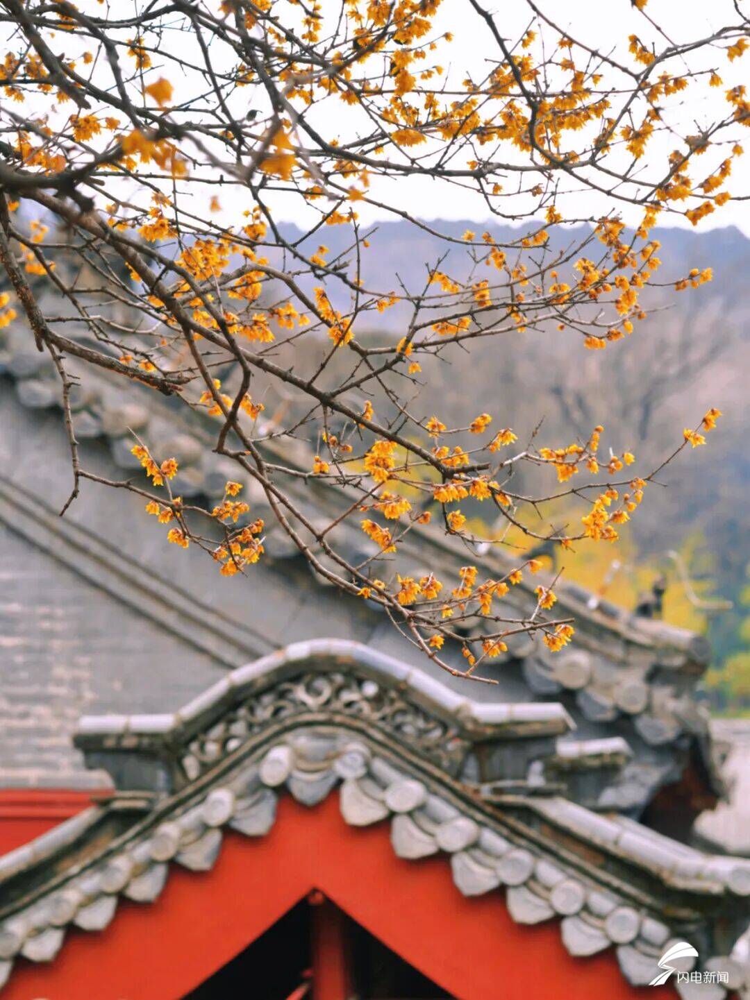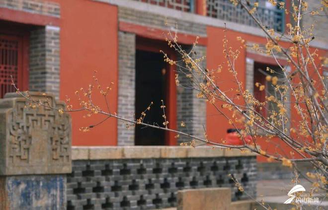 走进山门,朱红的院墙弯弯曲曲朝着前方延伸,瓦当于檐角勾勒出古朴的那种弧线,有虬曲的梅枝斜着探过了墙头,明黄的花瓣密密麻麻地缀在树枝头上,恰似把细碎的阳光揉进了枝桠之间,风刮过来的时候,暗香开始浮动,混合上松柏的清冽气息,弥漫过砖石铺成的甬道。