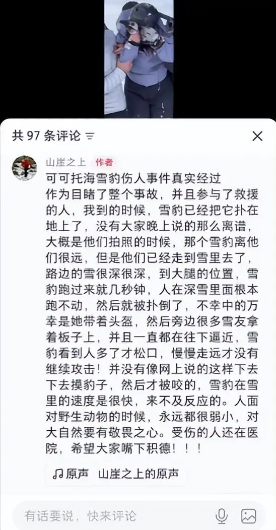 在事件开始呈迅猛态势发展的最起始阶段,伤者的同行伙伴于网络之上发出措辞以作辩解,声称那时一群人正驾驶着车辆朝着宾馆的方向返回,无非仅仅是在距离路边位置十米之遥的被积雪覆盖的地面上进行拍照活动,实在未曾预料到雪豹会从对面的山峰之上猝然迅猛地冲下来,伤者完全是未曾做任何不当之事却遭受牵连,纯属无辜躺枪 。