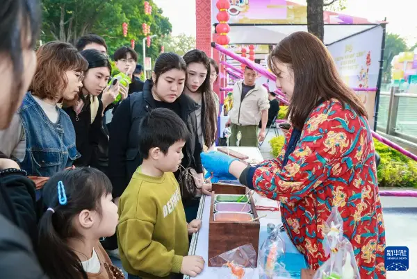 1月26日,在广州非遗市集那儿,香港吹糖人师傅薛锦屏,正在对小朋友进行吹糖人方面的指导(受访单位供图)。