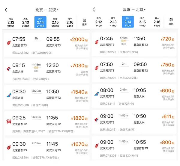 以一月三十日的价格作为例子,铁路一二三零六平台所显示的,二月十四日从北京去往武汉的经济舱票价呈现出千元各不相同的情况,然而“反向出行”的票价优势是非常明显突出的(图片截取自铁路一二三零六客户端)。