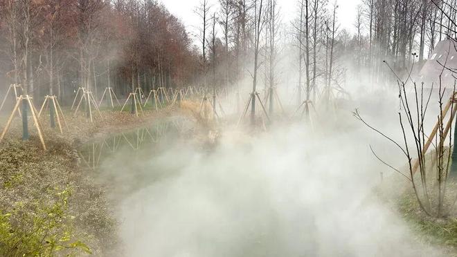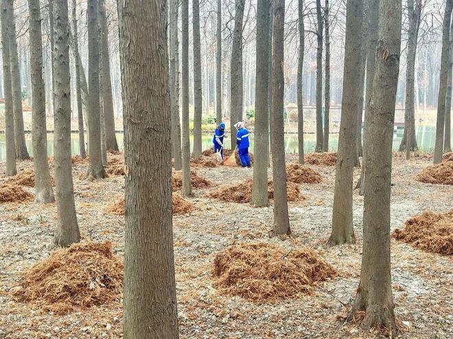 在采访的当天,正好碰上了微微细雨,水上森林被蒙蒙的雨雾给笼罩住了,就好像是一幅有着水墨氤氲之感的“江南水泽”图。杉林虽然已经过了观赏的时期,不过仍然能够看见橙红与深褐相互交织在一起,有工人正在把落叶扫成堆,准备去进行绿化废弃物的二次利用。