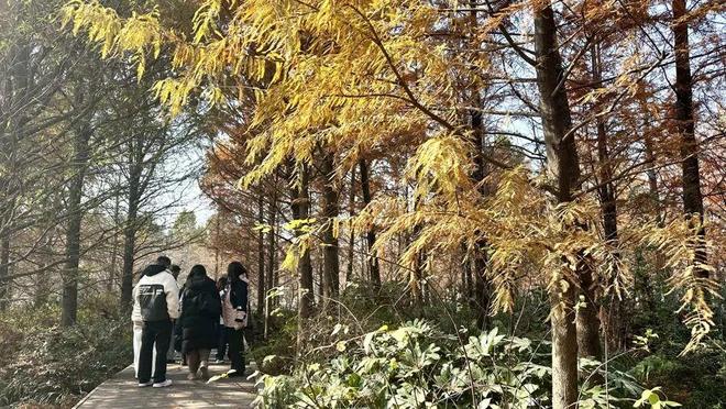 关于天气,它属于额外的那种“加持”因素。正常状况下,杉树到1月时叶片已然落下,然而今年是暖冬,开园之际呈现的仍是一片红色,于是就引发了刷屏现象。缪珊珊发出感慨,现代的年轻人喜爱郊野的感觉、森林的氛围乃至北欧风格的那种感觉,往年只有去到远郊的青西郊野公园才能够观赏到水上森林,现今在相对靠近市中心的地方便能够获得体验,从轨交市域机场线康桥东站出站就能够径直抵达,这大概当作是导致“出圈”的原因之一。