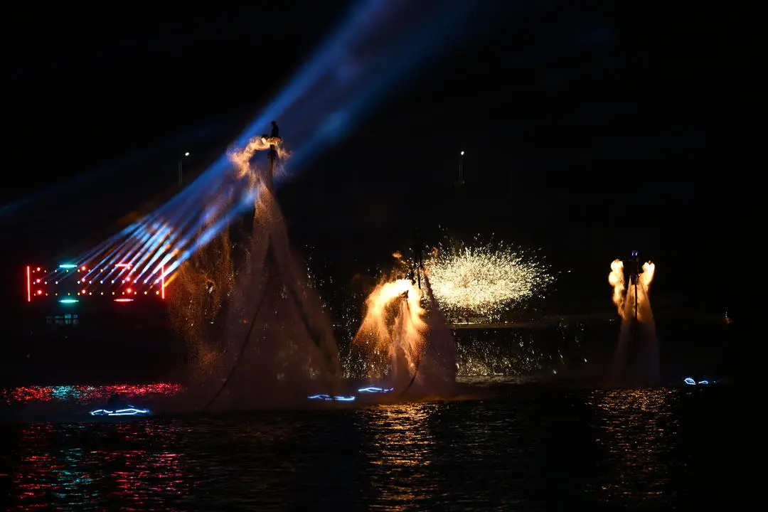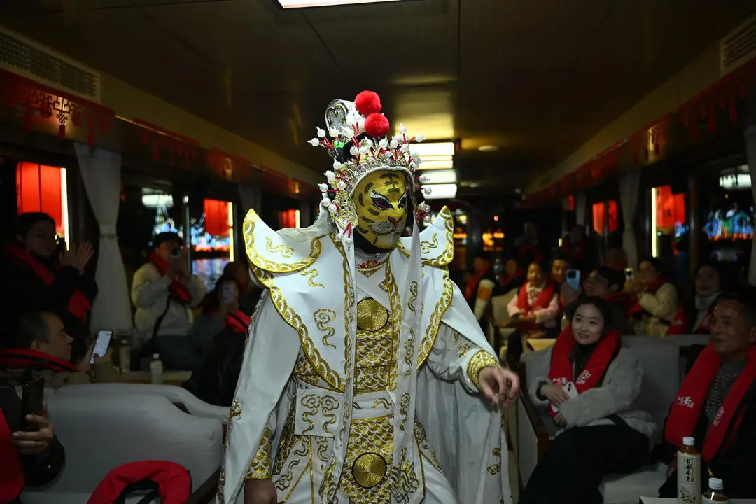 上船以后,戏幕一直不落。在船舱里面,小丑表演魔术、演员进行川剧变脸、艺人开展曲艺演艺等依次进行,游客们掌声持续不间断。在釜溪河上乘船夜游时,两岸的灯组夜景辉煌灿烂极其耀眼,让游客们眼界充分大开。