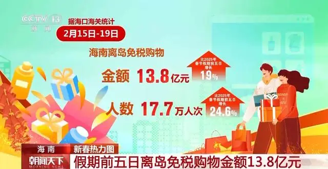 依据海口海关所做的统计,在2月15日至19日这个时间段,海南离岛免税购物的金额是13.8亿元,购物的人数是17.7万人次,相较于去年春节假期开始的前五天,金额增长了19%,人数增长了24.6%。