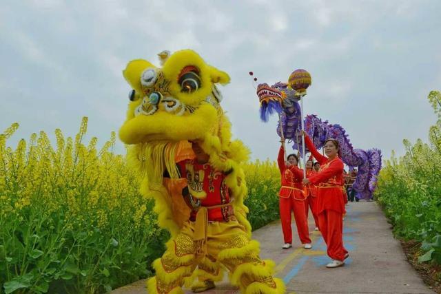 舞狮队穿行油菜花田