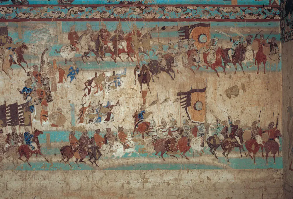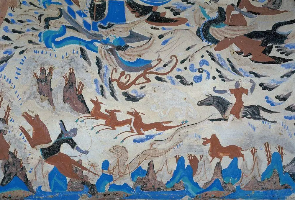 莫高窟第249窟里有一幅经典的狩猎图。在这图中,猛虎追赶着骑马的猎人,就在老虎前扑的那一刹那,猎人转身对准老虎拉弓搭箭,马儿扬起了前蹄,古代画工将这充满远古气息的紧张瞬间定格。被称为“帕提亚式射箭”的这种骑马者回身开弓的技法,最早出现在西亚,之后传入中国,成为了山水画的有机组成部分。