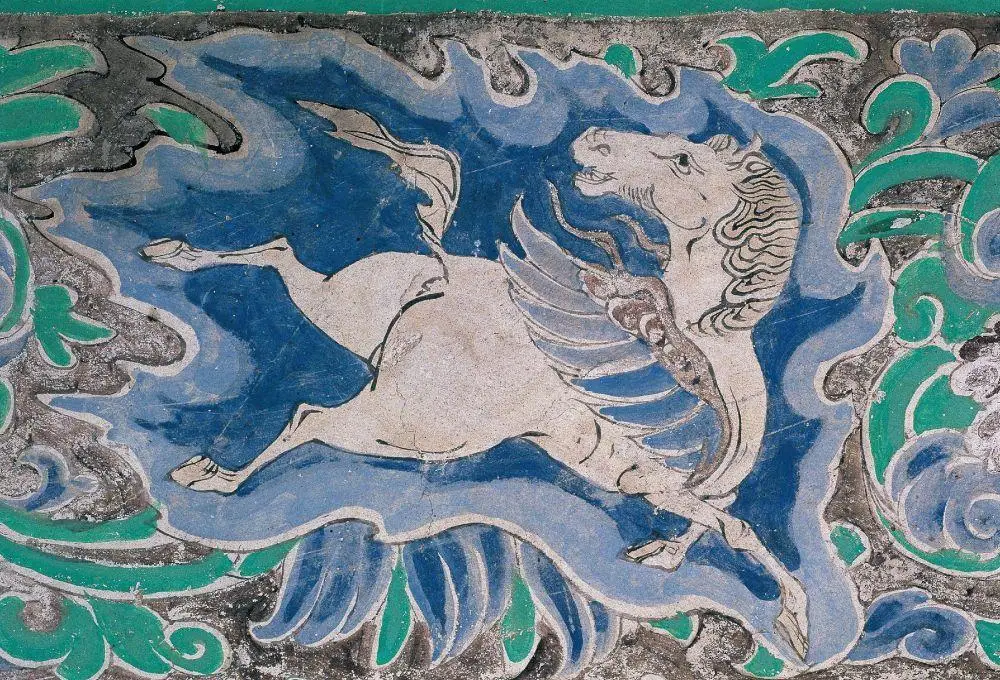 古人怀揣着满当当的浪漫想象瞧向马,处于有莫高窟“姊妹窟”赞誉之称的榆林窟那儿,第10窟藻井外围的装饰花边画着一匹遍体皆白、回转身子奔驰着的翼马,王嘉奇讲,白色的马生着蓝色的羽翼,两条在前的腿相互交叉起身加以腾踏,两条在后的腿朝着上空飞奔,臀部以及大腿位置的肌肉变得发达起来,翼马的造型显得简练,身姿颇为优美,它是同题材里的品质优良之作。