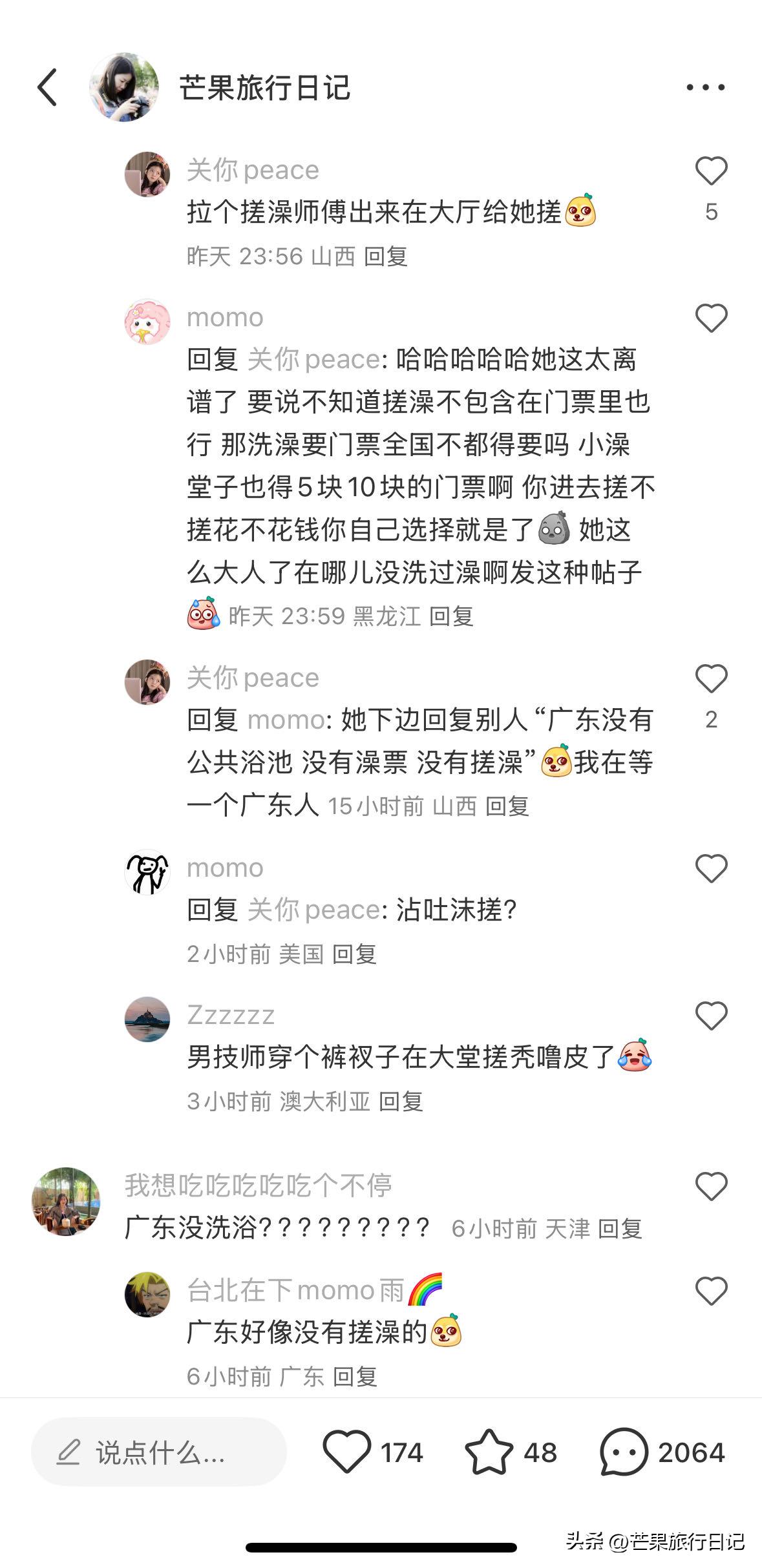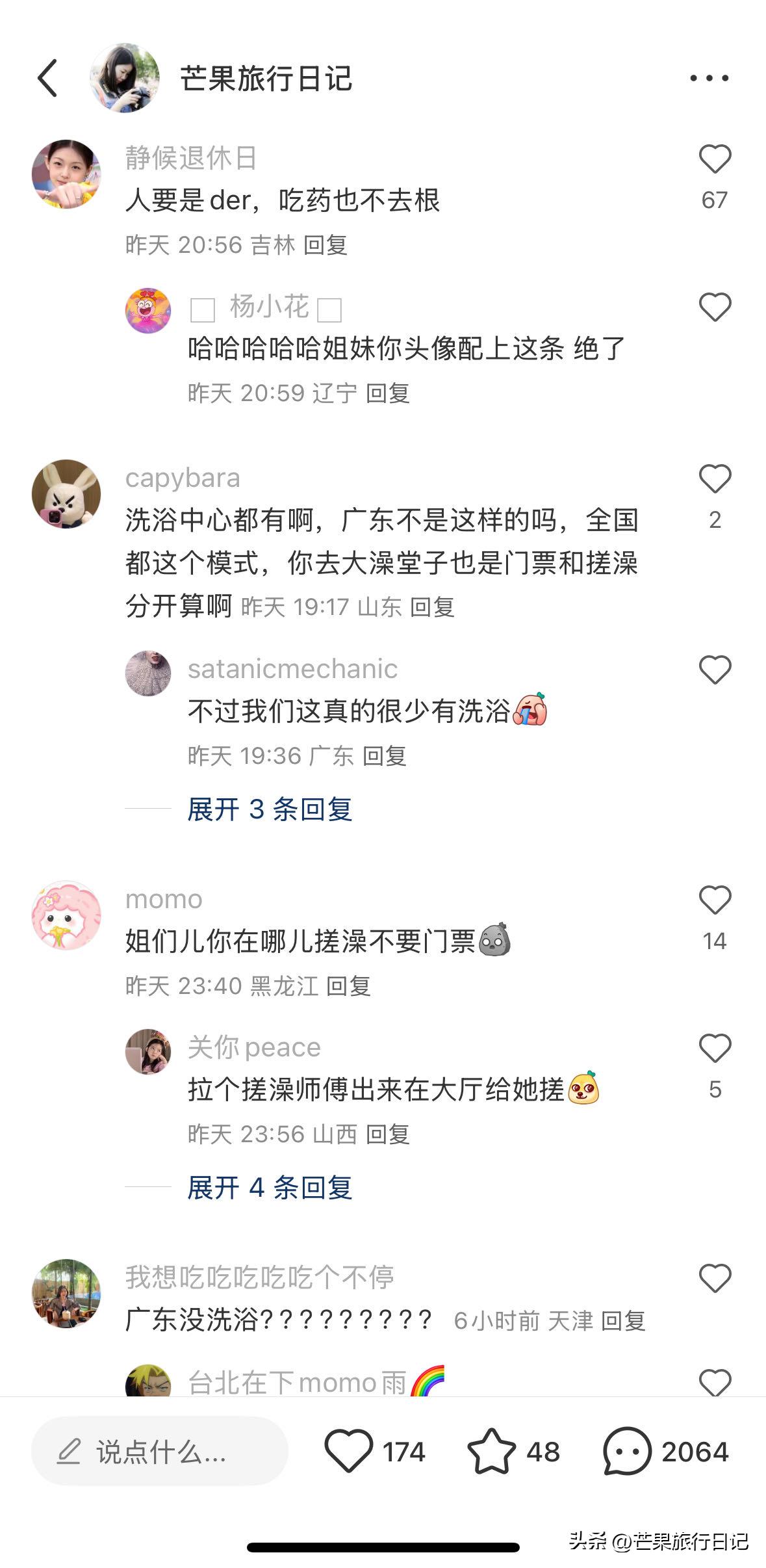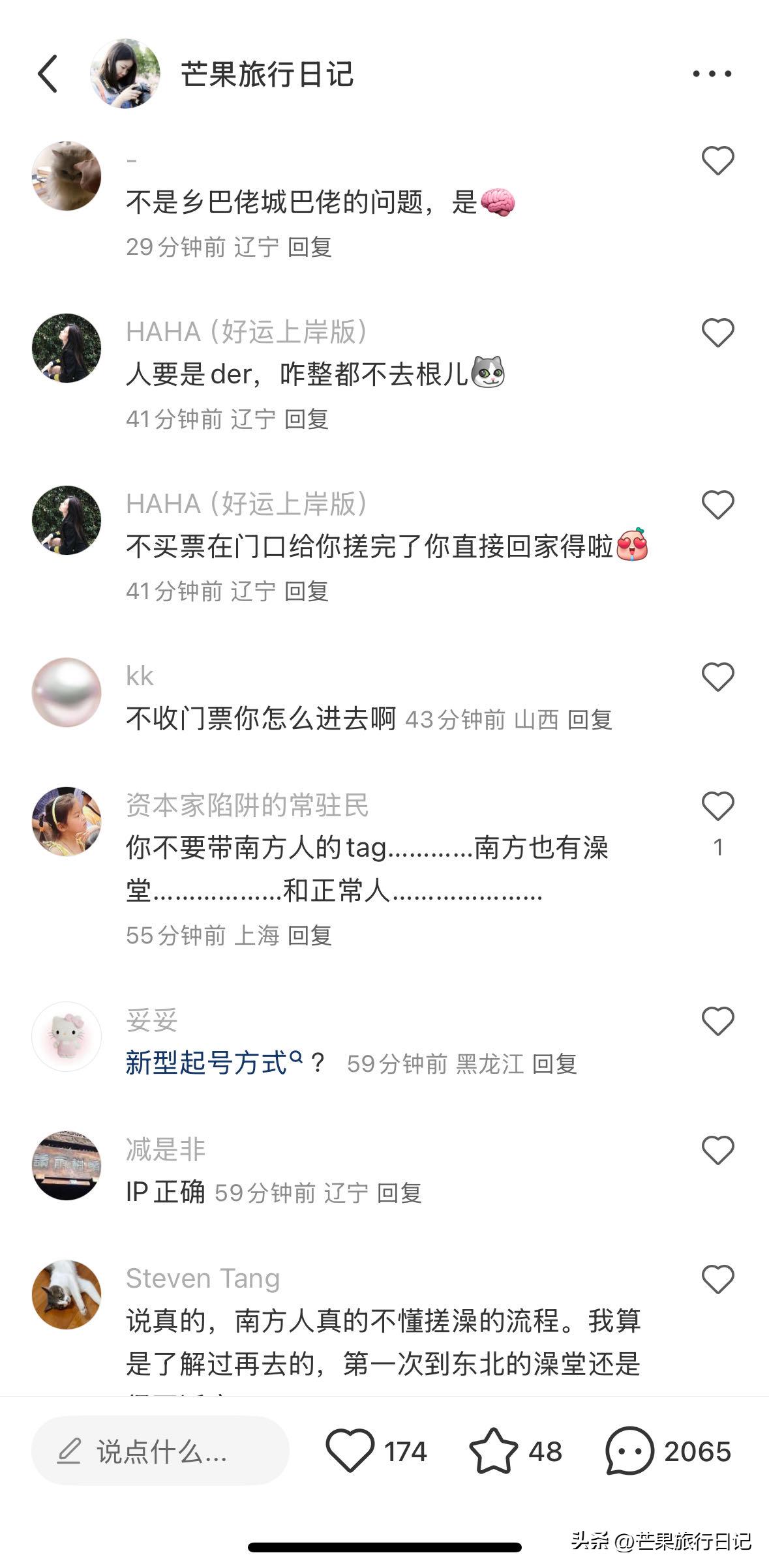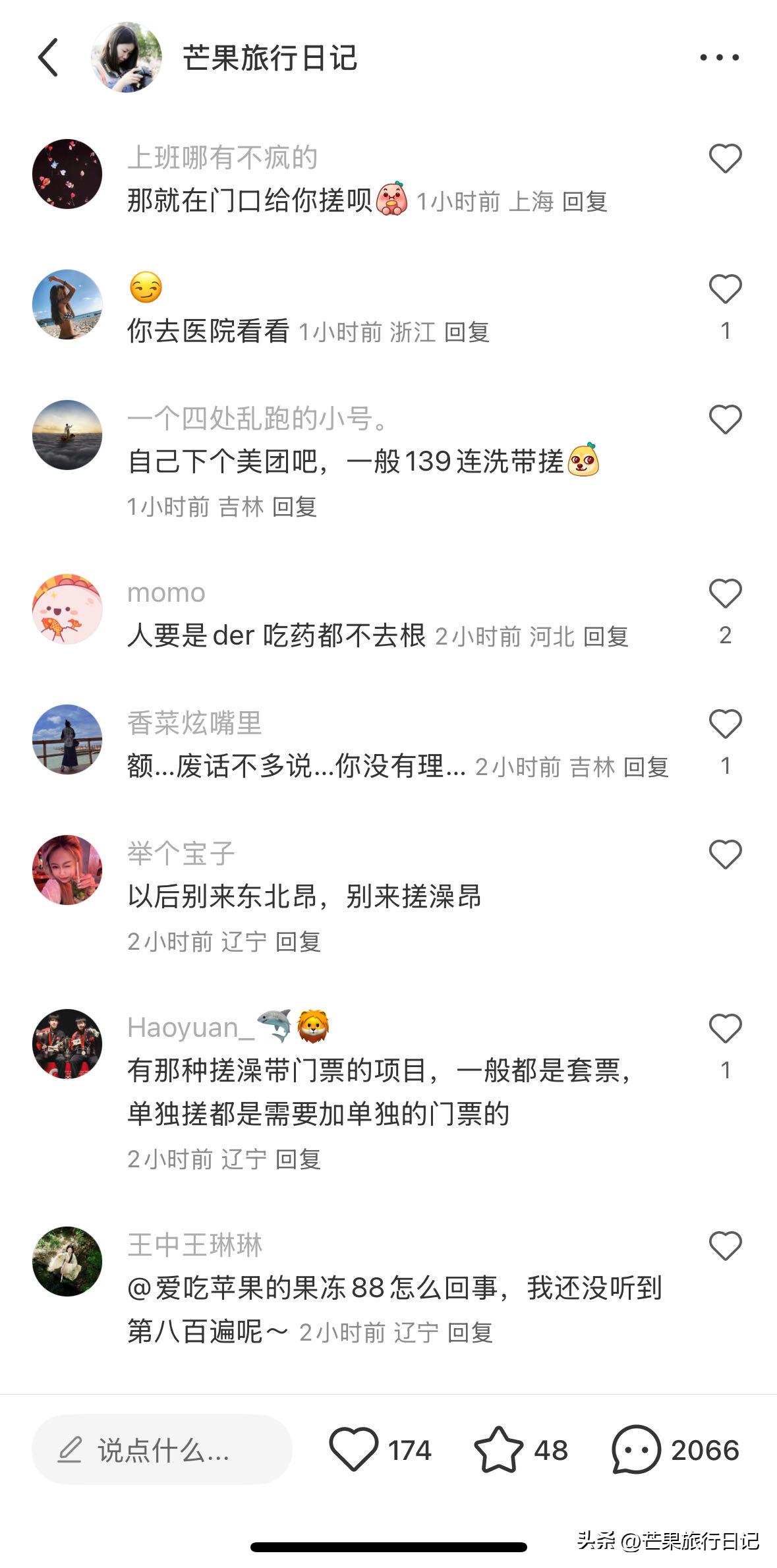 然而,东北人看样子似乎没办法领会我存在的这种理解上的偏差错谬,只因他们打小就晓得那种给人搓澡是还要另外掏钱购买门票费,还认为这是一种大家都该知晓的平常道理般的常识,觉得这在全国范围内所有人民都理应清楚明白的事儿,要是不清楚不晓得那可就是犯下了严重的错误如同碰触了天条一样,故而,当我把相关情况发布在某个特定平台的时候,遭到了差不多将近两千多条评论的指责诋毁啧骂,评论里说出不想买门票的话可以在大厅给你搓澡,在马路边给你搓呀之类言论评价,又或者是说我仅仅是想要不花钱占便宜、想免费去洗澡之类的负面诟骂话语。