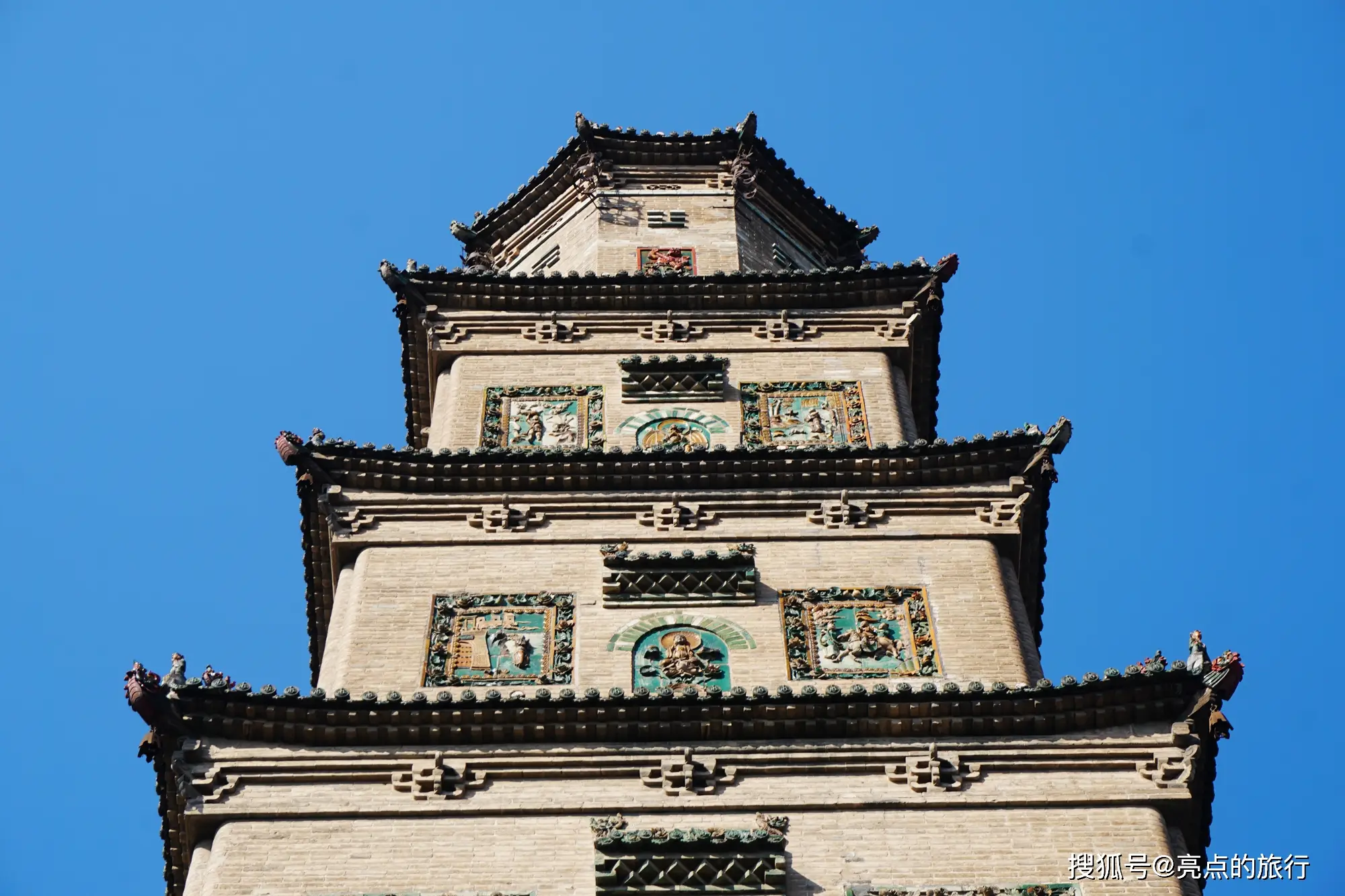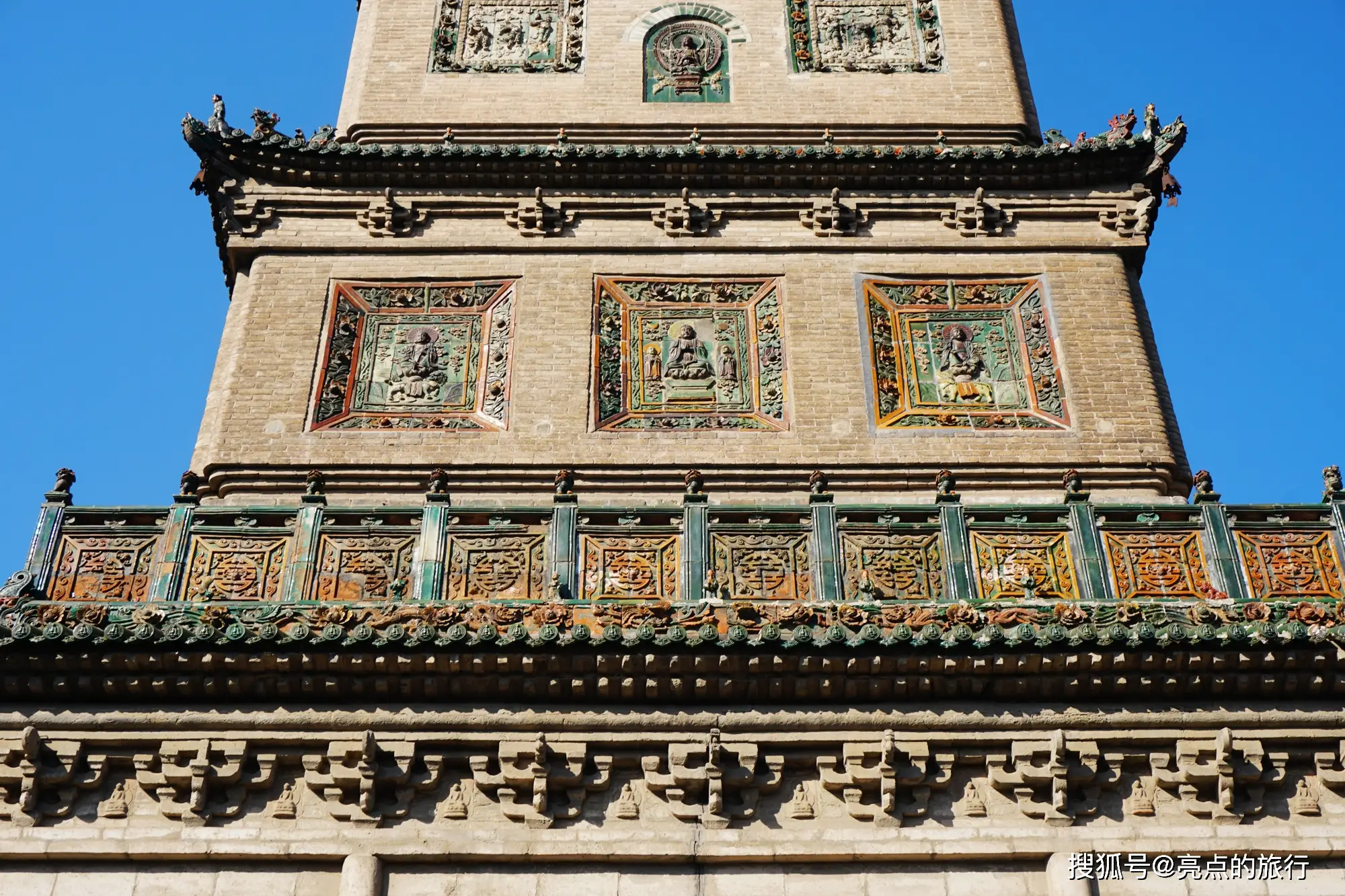 塔身二层往上,镶嵌着58幅属于佛教题材的琉璃浮雕,这些浮雕出自阳城琉璃很有名气的乔氏之手,并且都是关于佛以及佛传故事的,它们是清代琉璃艺术当中的精品。