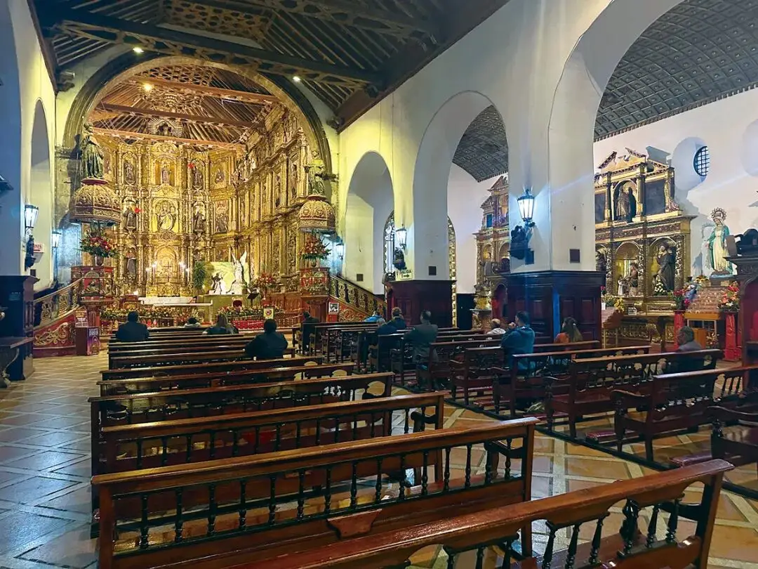 圣克拉拉教堂门外,就是国会大厦的后院,女警卫提醒我,要保管好手上的相机。我向北穿过游客罕至的街道,能闻到大麻和尿骚味,路过一些书摊,很快就抵达另一座教堂——圣弗朗西斯科教堂( de San)它将黄金极致演绎。该教堂建于1557~1621年,是波哥大现存最古老的教堂。镀金的雕刻和造像布满整个圣坛。三层楼阁堆叠起来,组成一个如天堂般的梦幻空间。