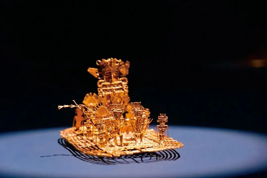 那个声名远扬的黄金博物馆,也就是Museo del Oro,在不远处,它收藏了数量超过5.5万件的,由黄金以及其他材质制成的器物,这些器物大多源自西班牙殖民之前的文明。这个博物馆不断地强调着,冶金术是人类最为伟大的成就当中的一个,并且4000多年以前,安第斯山脉中部的先民便已然掌握了成熟的金银加工技术。馆里面收藏有黄金海螺,还有面具,也有盔甲,甚至有装古柯粉末的容器。在这里,黄金不再是那种显得俗气的财富代表,而是被制作成了信仰的承载之物,成为了精密的仪器,乃至变成了理解土著人宇宙观的关键密钥。有一个金筏子,它工艺精绝,重量仅仅只有260克,筏子上面刻着酋长等人物,可称作镇馆之宝,被放置在单独的房间进行展示。还有另一个房间,里面上百件金饰分类排列组合形成一个圆形神坛,据说印第安人会把圣物扔到湖里来获得神的青睐,声光电特效每4分钟循环一次,营造出与神对话的氛围。