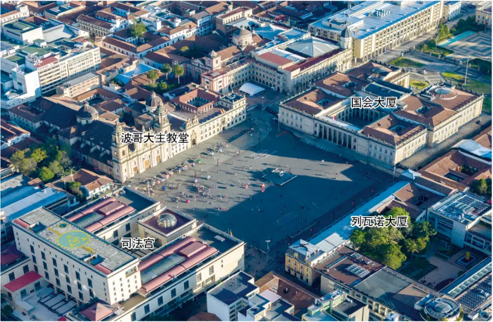 玻利瓦尔广场,处在波哥大市中心的位置,其四周是被立法、行政以及司法这些国家权力象征性建筑环绕着的。