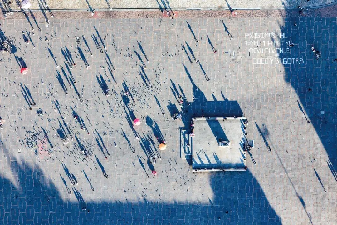 一群鸽子乌泱泱地纷飞着,我晓得玻利瓦尔广场(Plaza de Bolívar)抵达了——旅行攻略中记载着:“处于广场周围半径50米范围里面的任何人,鸽子均会朝着其投掷鸽屎‘炸弹’。”在广场的中央伫立着于1846年铸就的玻利瓦尔青铜铸造的塑像,这乃波哥大的第一座公共树立起来用于纪念的碑。在广场的南侧是气势非凡的国会大厦,在北侧则端坐着最高法院‘司法宫’,在西侧呢有着市长居住工作的列瓦诺大厦,在东侧矗立着波哥大主教堂。现在被称作“7月20日博物馆”的东北角的花瓶楼,1810年7月20日有“自主呼声”在此发生,那是哥伦比亚第一次争取自主的尝试,该尝试直到1819年才正式脱离西班牙,这里曾是殖民时代的斗牛场,曾是殖民时代的市场,曾是殖民时代的刑场,如今这里已是游客打卡地。我的航拍视角里,瓜达卢佩山高高在大教堂背后雄踞着,广场地面往上写着字样,那字样是“我们要求中央总参谋部这个反政府武装组织,以及佩特罗这个哥伦比亚总统,归还科科和比戈特斯,这是两个被反政府武装组织征召入伍后去世的年轻人” ,这是民众同时朝着反政府武装和政府提出的声讨。