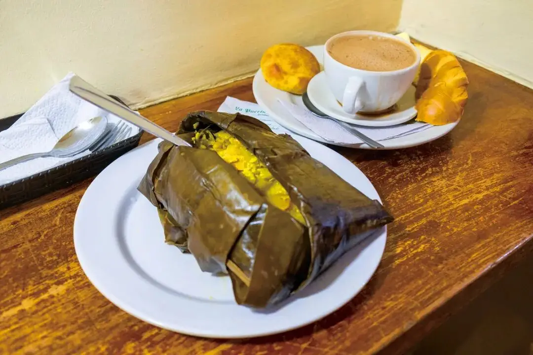 被称作“波哥大最著名小吃店”的广场附近假门餐厅(La Falsa),创建于1816年,橱窗里陈列着甜蜜糖果,最多容纳20人的店内面积不足15平米,一面大玻璃拓宽了空间视野。我在熙攘食客中辗转周旋,最终在二楼角落找到座位坐下,跟随周围人点了店家特色塔马利(Tamal)及一杯热巧克力。塔马利类似中国粽子,是用香蕉叶或玉米叶包裹的玉米饼。哥伦比亚各处馅料配方多种多样,这家店是土豆鸡肉馅的。