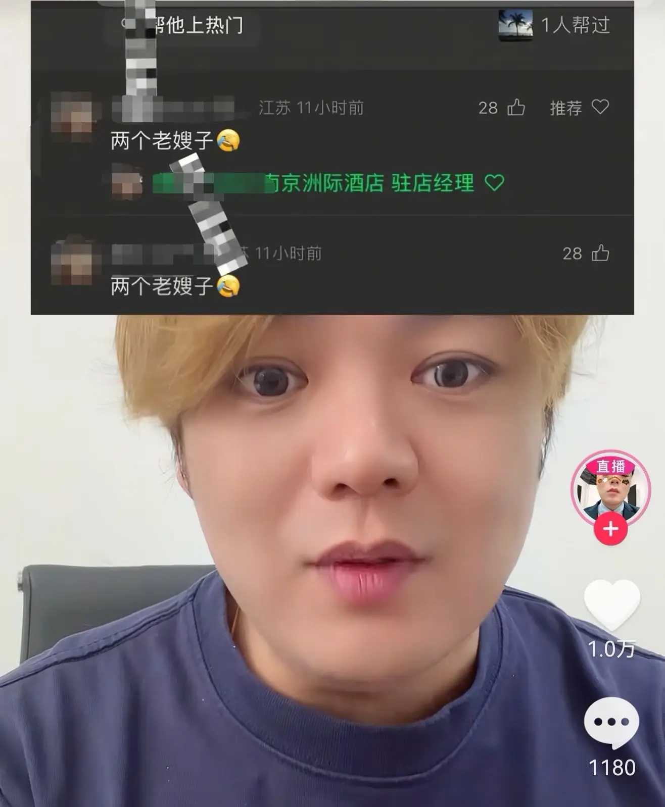 有一位酒店测评博主,于3月17日发布了一条视频,该视频内容与去年“勃勃不讲理”测评南京洲际酒店的情况相关,就在当天,“勃勃不讲理”在这条视频的评论区,看到了那位驻店经理写下的评论:“两个老嫂子”。