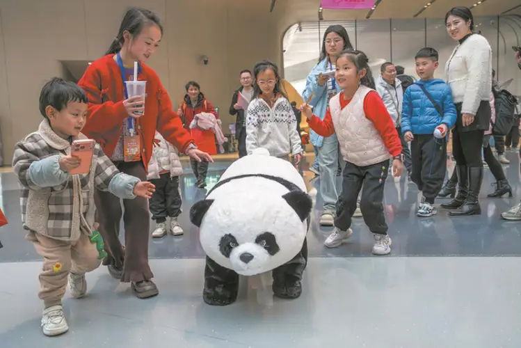 近年来,成都把全域开放当作机器人的训练场景,大力去发展AI机器人产业,进而形成了完整产业链,且聚焦于协作、物流、医疗等方向。有孩子与一只打扮成大熊猫模样的四足机器人展开互动。在机器人大世界,在天府四街的成都阿加犀智能科技有限公司,在东部新区的天府绛溪实验室,都存在可能现场见到正在接受训练的机器人,以此感受科技发展的脉动。蒋光丛 摄。