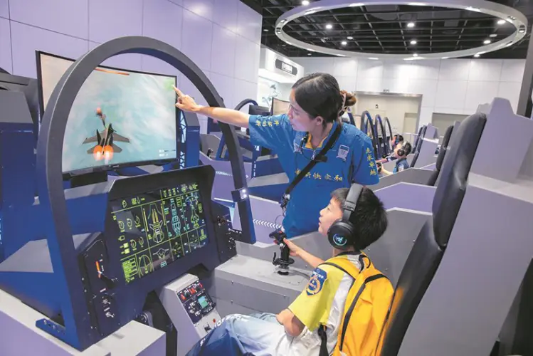 一名小朋友,在四川航空科技馆里,正体验着飞行模拟器,沉浸其中感受航空魅力,该科技馆位于彭州,其属于航空航天领域。近些年,成都的航空航天发展速度飞快,在民航旅客吞吐量方面,稳稳处于全国第三的位置。彭州的“天空之眼”基地,金堂的淮口机场等,都是参观成都市低空经济发展情况的很好去处。张鸿 摄。