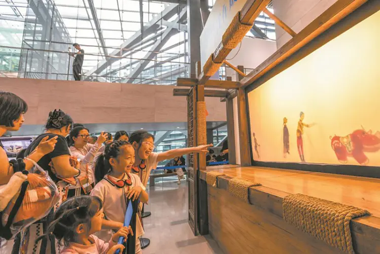 正在位于成都博物馆里,孩子们观看那里的皮影戏表演呈现文化传承。对于喜欢成都非遗文化的同学选择实在太多了,在春假期间,成都市川剧院的川剧表演值得去看,郫都区绣里·蜀绣融合创新产业园绣娘所进行的绣花作业也值得去瞧,就连成都皮影博物馆的百年展陈同样值得观赏。林漫 摄。