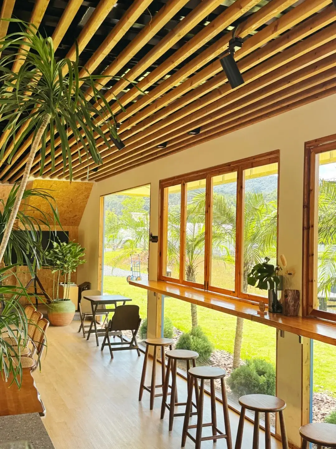 摆放着原木色的桌椅,角落里放置了几盆绿植,阳光透过落地窗照射进来,于木地板上勾勒出一格一格的光影。