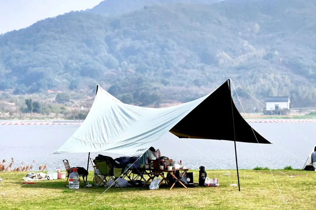 帐篷搭不搭都行,野餐垫铺开就能享受湖畔时光。