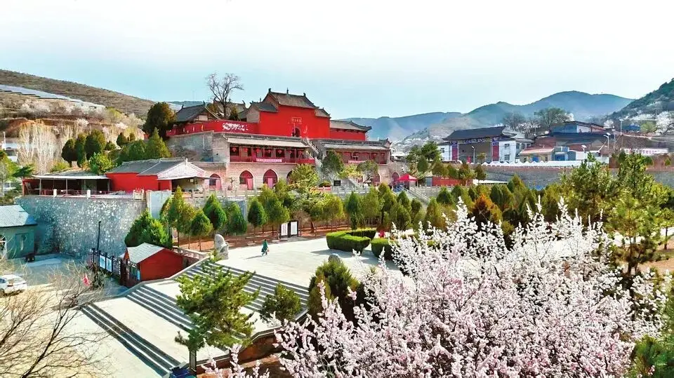 桃花在平顺县九天圣母庙盛开,红墙古建与之相互映衬,烂漫繁花与之相互映照,太行古刹呈现出春日的盛大景致,由本报通讯员拍摄。