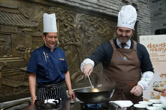 智利驻成都总领事克里斯蒂安・戴维斯学习制作麻婆豆腐。