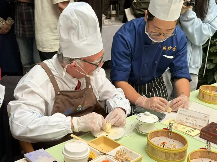 来自巴西驻成都总领事馆的代总领事杜瓦尔·德瓦斯康塞洛斯·巴罗斯,在川菜厨师的指导之下,进行捏面皮的行为。