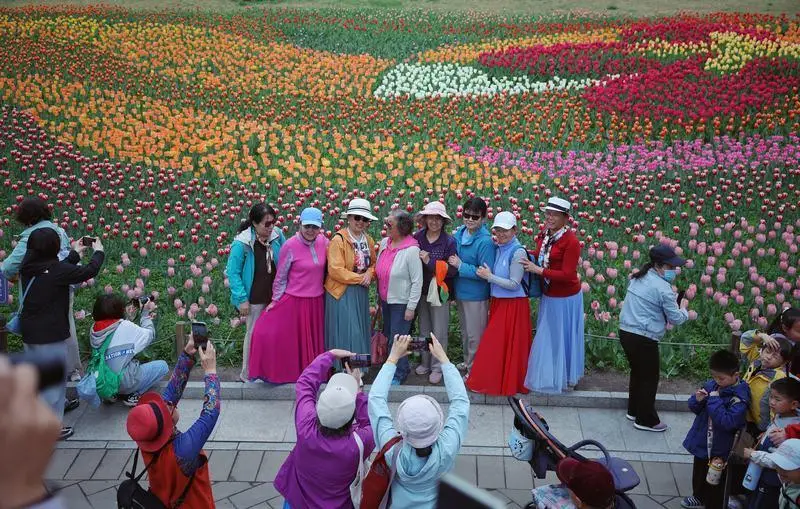 4月13日,于国家植物园(北园),有游客在郁金香花海处游玩,而后进行留影,此为新京报记者薛珺所拍摄。