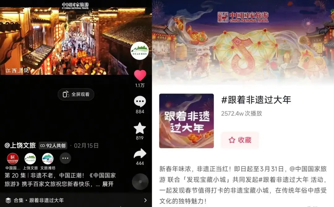 于2026年春节那期间,《中国国家旅游》协同抖音这个平台发起了线上活动,上饶文旅积极地去响应,用心地整合本地的非遗、特色民俗以及优质文旅资源,依靠多元创意内容,凭借跨界联动共创,全面地参与新媒体展示。一个方面是深深地耕耘原创,推出了AI上饶贺新春系列视频、上饶非遗系列视频、方言创意一系列视频、节日祝福此系列视频,还推出跟着歌曲游上饶系列视频;另一个方面是加强强化联动,和《中国国家旅游》携手,和百家文旅单位共同创作非遗贺新春视频,联合长沙、长春、拉萨打造《双城记》系列,并且跨省和岳阳等25家文旅单位联动发布共创内容,和快手官方联动推出“跟着吉祥物游上饶”主题视频。一系列的举措生动地展现呈现了上饶深厚的文化底蕴与独特的旅游魅力,达成实现了文化传播与文旅引流的双向赋能。